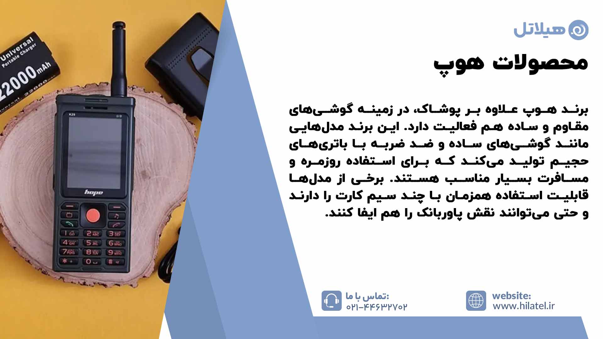 برند هوپ علاوه بر پوشاک، در زمینه گوشیهای مقاوم و ساده هم فعالیت دارد. این برند مدلهایی مانند گوشیهای ساده و ضد ضربه با باتریهای حجیم تولید میکند که برای استفاده روزمره و مسافرت بسیار مناسب هستند. برخی از مدلها قابلیت استفاده همزمان با چند سیم کارت را دارند و حتی میتوانند نقش پاوربانک را هم ایفا کنند.