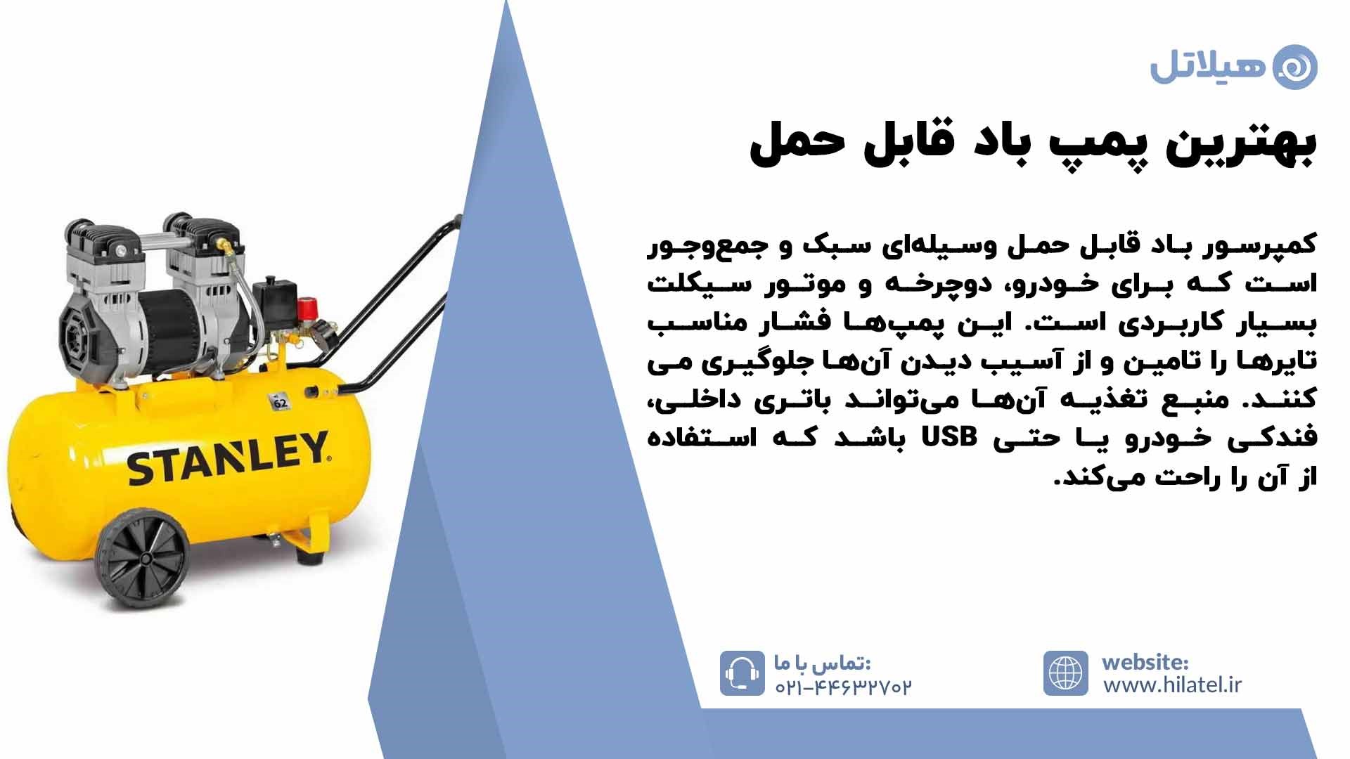 کمپرسور باد قابل حمل وسیلهای سبک و جمعوجور است که برای خودرو، دوچرخه و موتور سیکلت بسیار کاربردی است. این پمپها فشار مناسب تایرها را تامین و از آسیب دیدن آنها جلوگیری میکنند. منبع تغذیه آنها میتواند باتری داخلی، فندکی خودرو یا حتی USB باشد که استفاده از آن را راحت میکند.