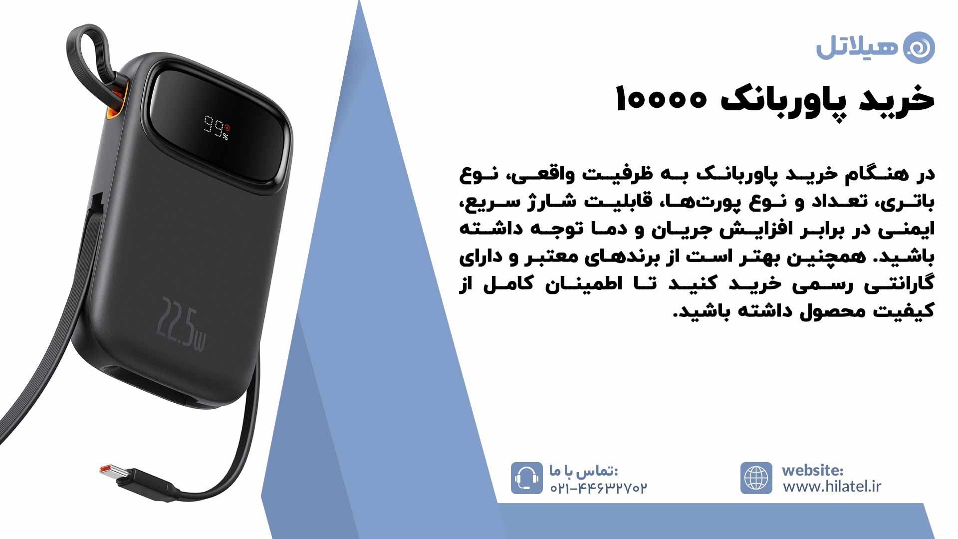 اگر به دنبال یک پاور بانک 10000 میلی آمپر ساعتی با کیفیت هستید، این وسیله گزینهای ایدهآل برای تامین انرژی دستگاههای همراه شما در طول روز است. بعلاوه، این پاوربانک با ظرفیت مناسب، قابلیت حمل آسان و وزن سبک، امکان شارژ سریع گوشی، تبلت و سایر گجتها را فراهم میکند.