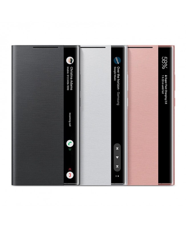 کیف هوشمند کلاسوری سامسونگ مدل Clear View Cover که در سه رنگ نقره ای ، مسکی و رزگلد تولید شده است که هم رنگ 3 رنگ گوشی ساموسنگ Galaxy Note 20 Ultra میباشد. از این کاور میتوانید برای هر دو نسخه این گوشی یعنی Note 20 Ultra  و Note 20 Ultra 5G استفاده نمایید. نشان دادن اعلان ها و تماس های دریافتی و پاسخ دادن آن ها بدون باز کردن درب کیف از قابلیت های این کیف هوشمند میباشد. کیف CVC Note 20 Ultra نسبت به کیف های ژله ای حفاظت کمتری دارد اما ظاهری شیک و جذاب را به گوشی شما میدهد. بالا و پایین کیف CVC Note 20 Ultra باز است و پوششی به گوشی شما نمیدهد.