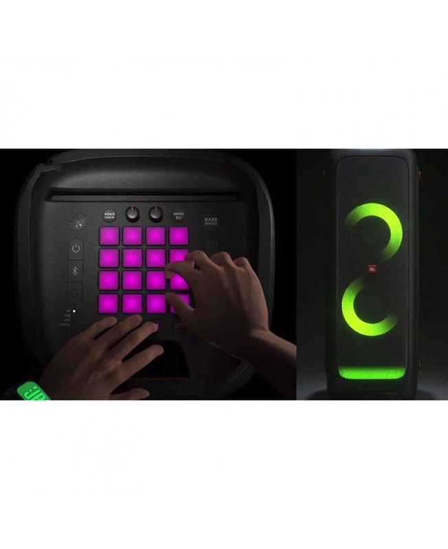 اسپیکر پارتی باکس 1000 دارای یک پنل مخصوص برای کنترل افکتهای نورپردازی است و با استفاده از این پنل مخصوص، میتوانید نورپردازی را به گونهای که خود مایل به آن هستید شخصی سازی و پخش کنید. در قسمت بالای JBL Partybox 1000 یک پد مخصوص دیجی قرار گرفته که توانایی کنترل رنگ چراغها، افکتهای صدا و افکتهای شخصیسازی و پخش موسیقیهای مختلف را دارد. همچنین با فشردن دکمهی مخصوص پد دی جی این اسپیکر ، با توجه به رنگ پد ها میتوانید به پخش Piano، DJ Effects، Drums و Keyboard دسترسی داشته باشید. در قسمت پشت پارتی باکس 1000 قسمتی برای ورودیهای میکروفون و گیتار نیز طراحی شده است که با اتصال سرجک های میکروفون و گیتار خود به این ورودی ها میتوانید بخوانید و بنوازید و صدای خود را از این اسپیکر بشنوید، و با دو عدد کنترل کننده آن صدای میکروفون و گیتار خود را کنترل کنید.در قسمت زیرین JBL Party Box 1000 نیز چرخهایی تعبیه شده تا به منظور راحتی و سهولت شما در هنگام انتقال اسپیکر، مورد استفاده قرار گیرد تا اسپیکر خود را به هر مکان که مایل هستید منتقل کنید.