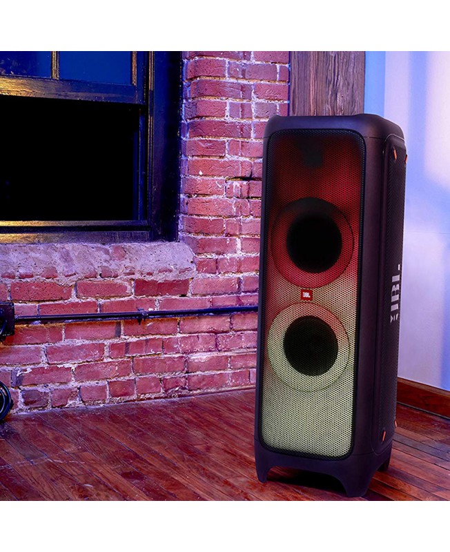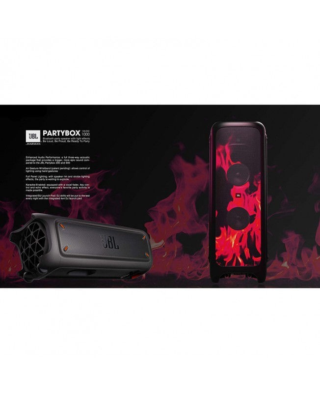 PartyBox 1000 یک اسپیکر قوی و مخصوص میهمانیهای بزرگ است که با صدای قدرتمند و مخصوص طراحی شده توسط کمپانی JBL هیجان و لذت را به مهمانی های شما می آورد. پارتی باکس 1000 دارای پنلی با رقص نور هیجان انگیز است و تنها کافی است میکروفون یا گیتار خود را به آن متصل کنید یا میتوانید به صورت بیسیم و با سیم با دستگاه پخش کننده خود به این اسپیکر متصل شوید و موسیقیهای مورد علاقه خود را پخش و از آن لذت ببرید.