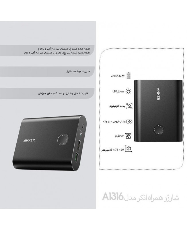 پاور بانک PowerCore A1316 برند انکر دارای بدنه آلومینیومی مقاوم در برابر خط وخش ، باتری لیتومی یونی با ظرفیت 13400 میلی آمپر ساعت و وزنی حدود 303 گرم با ابعاد 9.9* 7.8*2.3 سانتی متر است. این پاور بانک دارای دو پورت USB می باشد که یک پورت آن به رنگ سبز و با بهره گیری از شارژ سریع کوالکام 3.0 (Qualcomm Quick Charge 3.0) گوشی شما را به سرعت شارژ می کند.و حتی اگر به شارژ بیش از یک عدد دستگاه نیاز دارید، مجبور نیستید ساعتهای طولانی منتظر شارژ شدن هرکدام بمانید؛ چرا که Anker PowerCore A1316 دارای دو درگاه USB با تکنولوژی پاور آی کیو است. همچنین شما می توانید وضعیت شارژ پاوربانک را از طریق نشانگرهای LED که بر روی بدنه آن طراحی شده است بررسی کنید به طوری که هر نشانگر LED نشان دهندهی 10 درصد شارژ می باشد. PowerCore A1316 در برابر افزایش ولتاژ، جریان و دما مقاوم است با استفاده از تکنولوژی منحصر به فرد MultiProtect برای کنترل دمای آن در هنگام شارژ اگر دمای بالا تشخیص داده شود، به طور خودکار قدرت را کاهش می دهد. همچنین دارای Voltag Boost تشخیص مقاومت کابل برای شارژ دهی سریعتر و Power IQ قابلیت تشخیص شدت جریان به صورت هوشمند برای دستگاه شما است. و در آخر که این پاوربانک برای انواع گوشیها و تبلتها و دستگاههای پخش موزیک همراه مناسب می باشد.