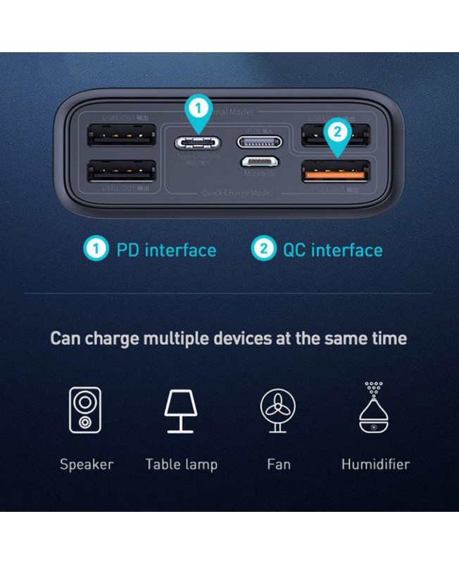 پاوربانک بیسوس با ظرفیت 30000 میلی آمپر ساعت دارای 5 پورت خروجی برای شارژ دستگاه و 2 پورت ورودی برای شارژ پاوربانک می باشد و توانایی پشتیبانی از شارژ سریع 33 واتی را نیز داراست.