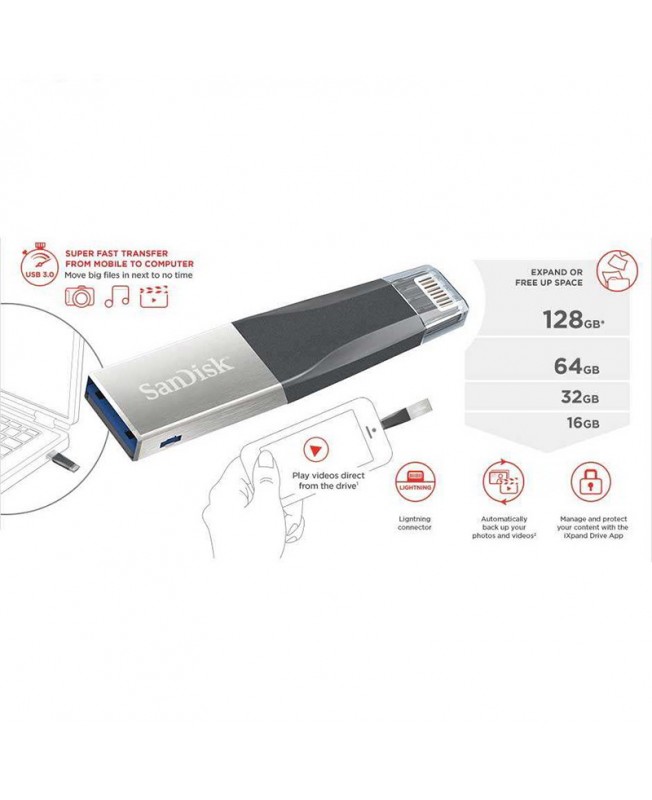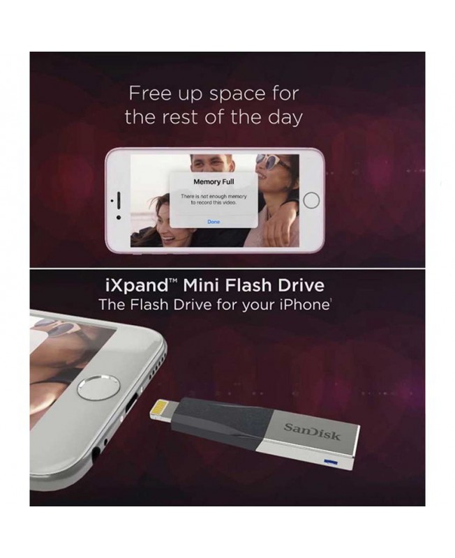 فلش Ixpand mini برند سن دیسک با طراحی بسیار زیبا و ابعاد 4.6*12.1*53 میلی متر و وزن 4.5 گرم می تواند تا ظرفیت 32 گیگابایت فضا را برای انتقال اطلاعات فراهم کند، بدنه iXpand Mini نیز از جنس فلز باکیفیت و مقاوم و با قابلیت ضد اثرانگشت و لکه ساخته شده تا شما بتوانید به راحتی آن را حمل کنید و نگران آسیب دیدن آن نباشید.همچنین فلش مموری سن دیسک دارای دو درگاه USB3.0 و لایتنینگ است که این امکان را به وجود می آورد تا علاوه بر اتصال به دستگاهای دارای پورت USB به گوشی هایی که از درگاه لایتنینگ پشتیبانی می کنند نیز متصل شود و اطلاعات را با سرعت 5 گیگابیت بر ثانیه انتقال دهد.در آخر هم باید به این نکته اشاره کرد که برند Sandisk برای محافظت از درگاه لایتنینگ این فلش مموری در مقابل شکستن و آسیب های احتمالی یک درب پلاستیکی طراحی کرده است تا در صورت عدم نیاز به استفاده آن را جمع کنید.