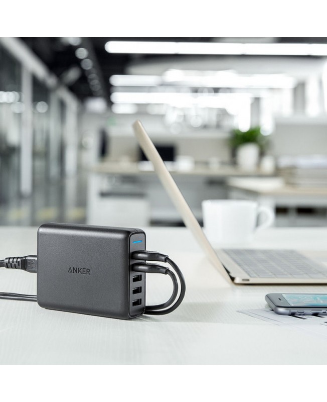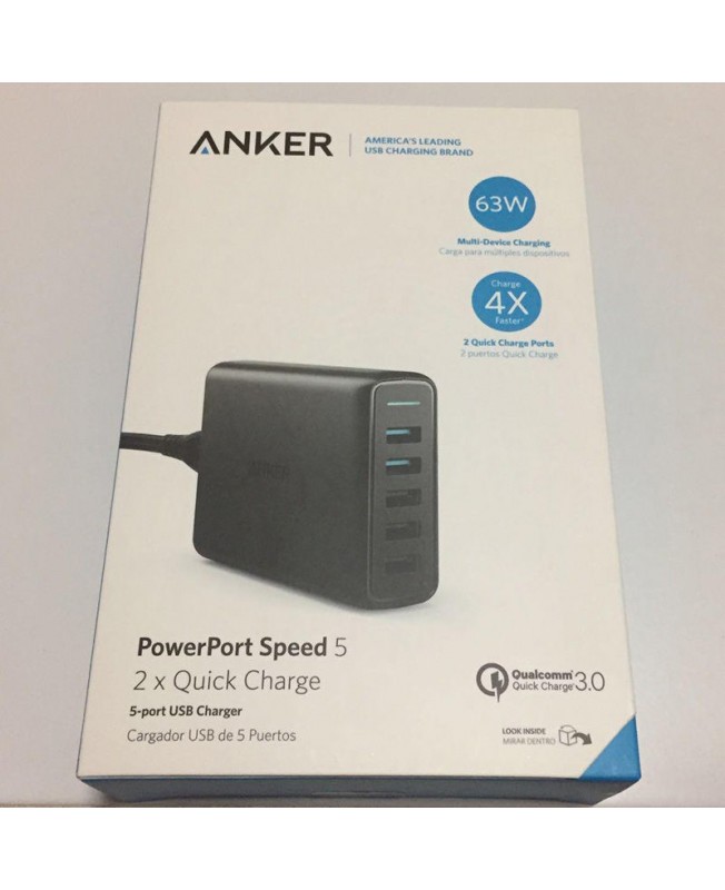 شارژر دیواری انکر مدل A2045 با 5 درگاه خروجی و تکنولوژی شارژ سریع Qualcomm 3.0 که مجموع توان خروجی آن 63 وات می باشد.