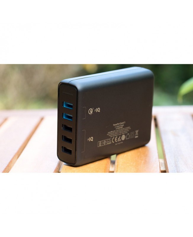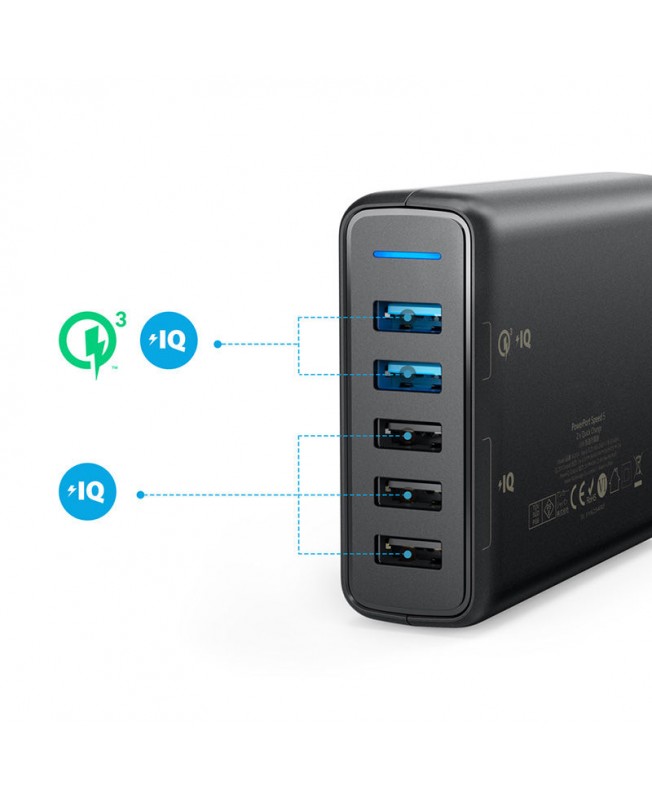 آداپتور شارژ انکر مدل PowerPort Speed 5 مناسب برای افرادی است که همزمان می خواهند چند دستگاه را با هم شارژ نمایند. 5 درگاه خروجی روی این آداپتور وجود دارد که همه آنها دارای تکنولوژی Power IQ هستند و بدین معناست که به لطف چیپستی که داخل آن وجود دارد ، میزان ولتاژ و آمپر دستگاهی که در حال شارژ است را تشخیص می دهد و طبق همان دستگاه را شارژ می کند. همچنین 2 درگاه خروجی روی آن دارای تکنولوژی شارژ سریع Q 3.0 می باشند که رنگ آن ها نیز آبی است. Q 3.0 یک تکنولوژی شارژ سریع است که چیپست آن را شرکت معروف Qualcomm ساخته است و بیشترین توان شارژ آن 18 وات است. همچنین توان کلی 5 درگاه خروجی Anker A2045 نیز 63 وات می باشد.
