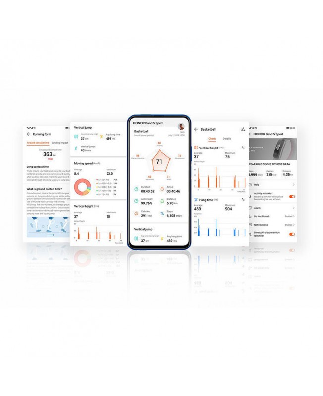 مچ بند هوشمند هواوی آنر بند 5 اسپرت از اکثر قابلیت‌هایی که مچ بند های هوشمند معمولی دارد برخوردار است اگرچه این مچ بند سنسور اندازه‌ گیری ضربان قلب ندارد اما در کل گزینه مناسبی میواند برای علاقه مندان به این نوع گجت ها بخصوص بسکت بالیست ها باشد. این مچ بند با گوشی‌های اندروید 4.4 و بالاتر و گوشی‌های دارای سیستم عامل iOS ورژن 9.9 و بالاتر سازگار است؛ برای سینک شدن گوشی خود با این مچ بند باید اپلیکیشن Huawei Health را نصب کنید.