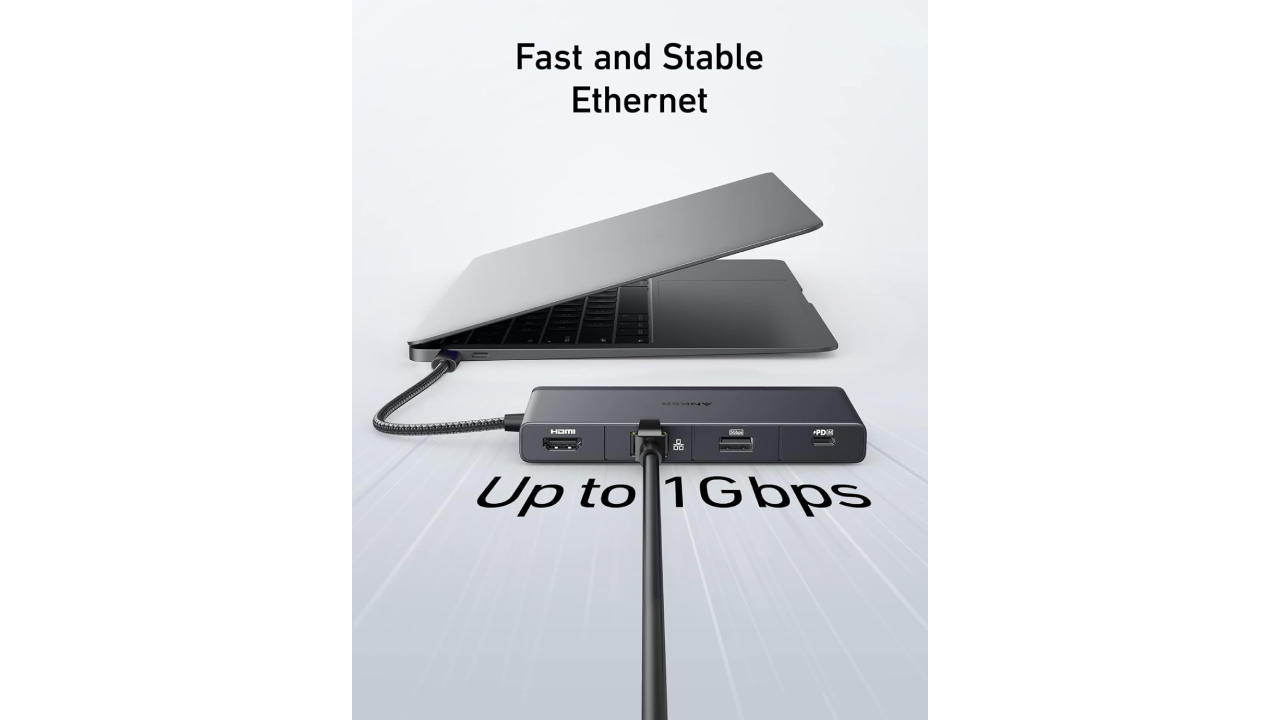 پورت اترنت گیگابیتی موجود در هاب Anker 552 قابلیت پشتیبانی از سرعت های 10/100/1000Mbps را ارائه می دهد، که آن را به گزینه ای مناسب برای کاربرانی تبدیل می کند که به اتصال پایدار و سریع نیاز دارند. این پورت امکان اتصال مستقیم به شبکه های کابلی را فراهم می کند و به ویژه در محیط هایی که شبکه بی سیم (Wi-Fi) ضعیف، ناپایدار، یا پر ازدحام است، بسیار کاربردی است.