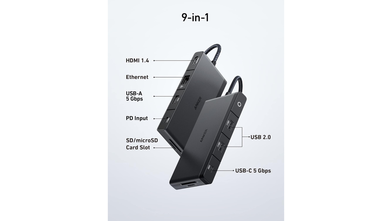 هاب Anker 552 با 9 پورت متنوع شامل دو پورت USB 3.0 با سرعت 5Gbps، دو پورت USB-A با سرعت 480Mbps، یک پورت HDMI با وضوح 4K@30Hz، یک پورت PD-IN با توان ورودی تا 100 وات، یک پورت اترنت با سرعت 1000Mbps و اسلات کارت SD و microSD با سرعت 104MB/s طراحی شده است. این مجموعه پورت ها امکان اتصال هم زمان دستگاه هایی مانند مانیتور، لپ تاپ، گوشی هوشمند و کارت حافظه را فراهم می کند و نیازهای کاربران را به خوبی برطرف می سازد.