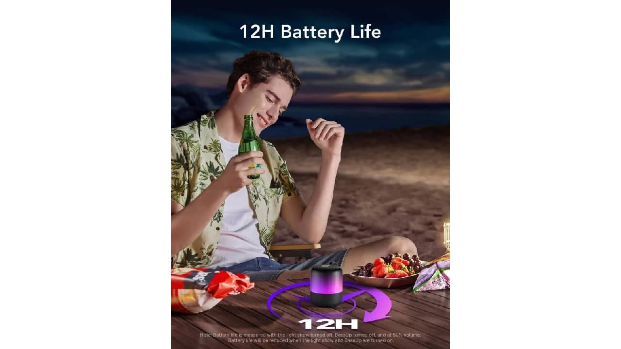 Anker Glow Mini A3136 با یک بار شارژ کامل، قادر است تا 12 ساعت پخش موسیقی را ارائه دهد. این زمان برای استفاده در اکثر مهمانی ها، پیک نیک ها و سفرهای روزانه کافی است. البته باید توجه داشت که استفاده از افکت های نوری می تواند عمر باتری را کاهش دهد. زمان شارژ کامل این اسپیکر حدود 2 ساعت است و از طریق پورت USB-C شارژ می شود. همچنین، این اسپیکر دارای نشانگر میزان شارژ است که به کاربران امکان می دهد از وضعیت باتری مطلع شوند.