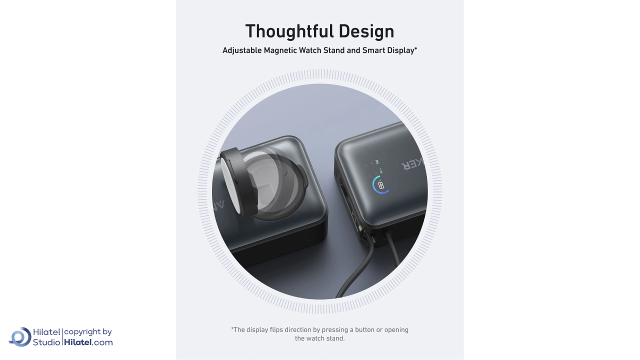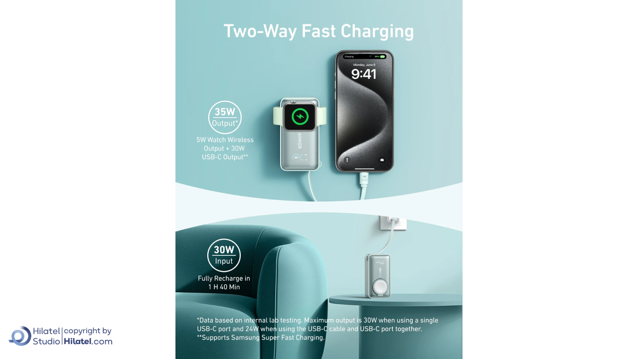 این پاوربانک امکان شارژ همزمان اپل واچ و سایر دستگاه ها را فراهم می کند. با خروجی ۳۰ وات از طریق کابل USB-C و ۵ وات از طریق شارژر بی سیم مخصوص اپل واچ، می توانید چندین دستگاه را به طور همزمان شارژ کنید.