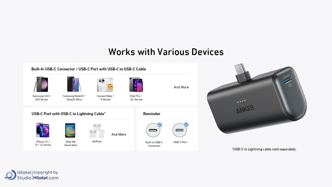 پورت و رابط تایپ سی: Samsung S22 and S23 Series Samsung Note20 / Note20 Ultra Huawei Mate / P Series iPad Pro / Air Series و بقیه دستگاه های دارای این پورت پورت تایپ سی(کابل تایپ سی به لایتنینگ): iPhone 12 / 13 / 14 Series iPad 9th Generation AirPods |