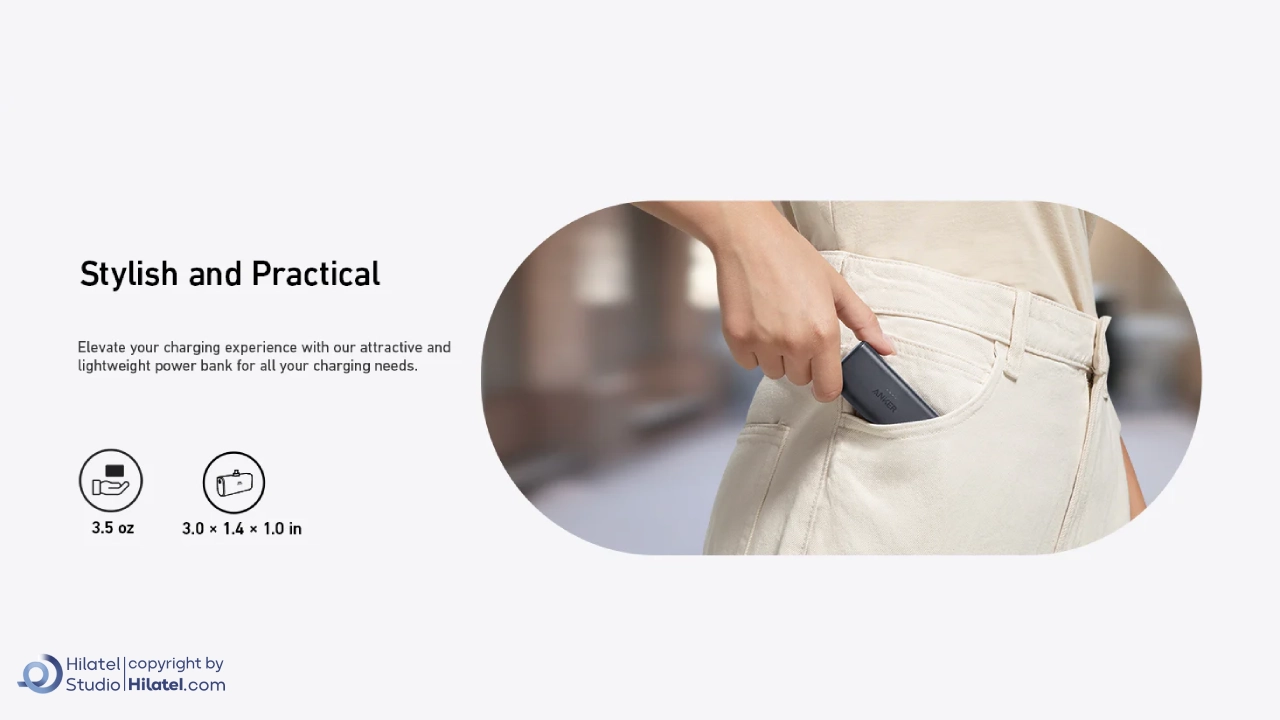 حمل آسان: این پاوربانک Anker A1653 با ابعاد کوچک و وزن کم، به راحتی در کیف یا جیب جای می گیرد.