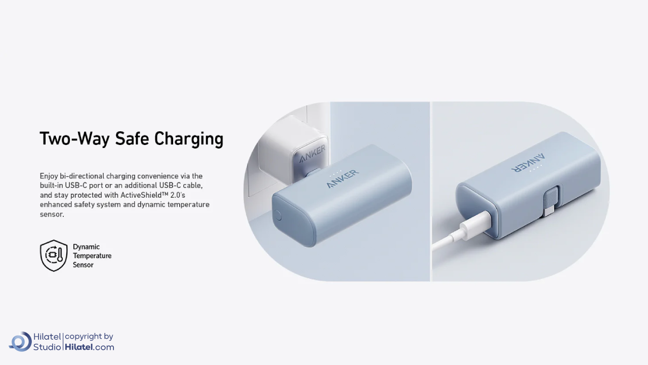 محافظت از دستگاه: پاوربانک 22.5 وات 5000 میلی آمپر انکر مدل A1653 با فناوری ActiveShield™ 2.0 دمای دستگاه را اندازه گیری کرده و در صورت داغ شدن، از آن محافظت می کند. همچنین این پاوربانک از ورود جریان برق کنترل نشده به دستگاه جلوگیری می کند.