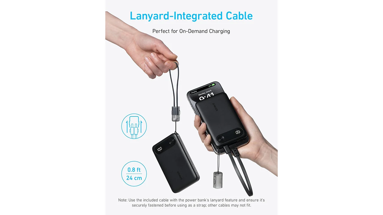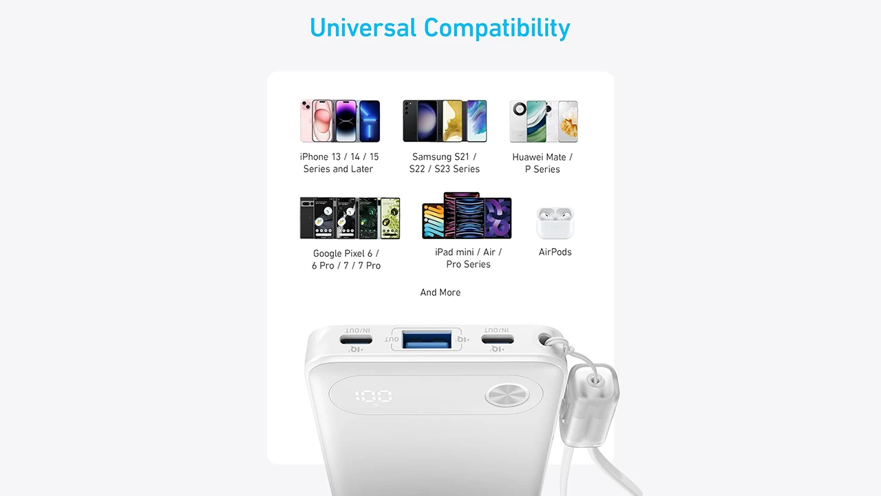 دیگر ویژگی منحصر به فرد این دستگاه، امکان شارژ دو دستگاه به طور همزمان می باشد. در واقع بر روی این پاوربانک از یک پورت USB-C و یک پورت USB-A استفاده شده است. علاوه بر این با استفاده از کابل USB-C داخلی می توانید بدون نیاز به کابل اضافی، دستگاه های خود را شارژ کنید.