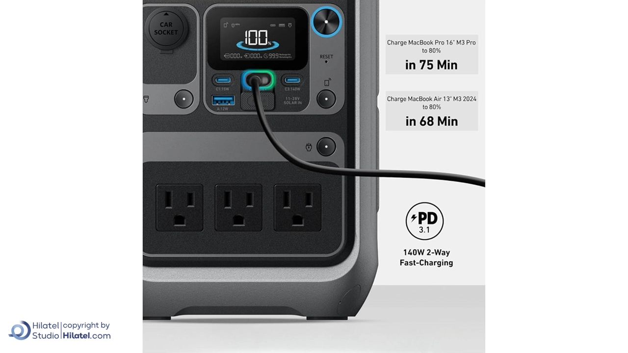 خروجی USB-C یک درگاه دو طرفه (Input/Output) با توان ۱۴۰ وات است. این درگاه برای شارژ سریع لپ تاپ های مک بوک یا تبلت استفاده می شود. همچنین برای شارژ موبایل و پاوربانک ها نیز کارآمد است. پورت های USB-A این دستگاه برای شارژ هم زمان چند وسیله طراحی شده اند. این درگاه ها برای شارژ دستگاه های کوچک مانند ساعت های هوشمند یا اسپیکرهای قابل حمل مناسب هستند.