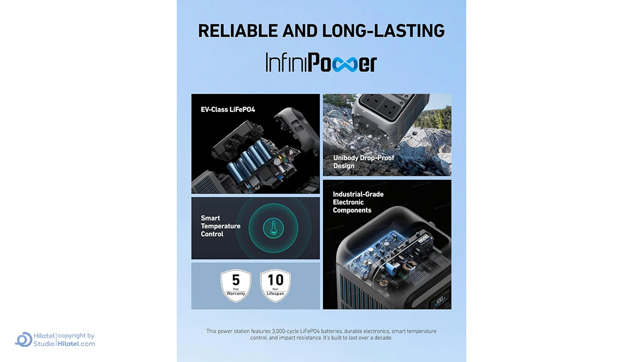 پاور استیشن انکر مدل SOLIX C300 با توان 600 وات، یک باتری LFP (لیتیوم - آهن - فسفات) دارد. این نوع باتری نسبت به باتری های لیتیوم - یونی معمولی، طول عمر بیشتر و دوام بالاتری دارد. باتری LFP در برابر گرما یا شارژ زیاد ایمن تر عمل کرده و دیرتر آسیب می بیند.