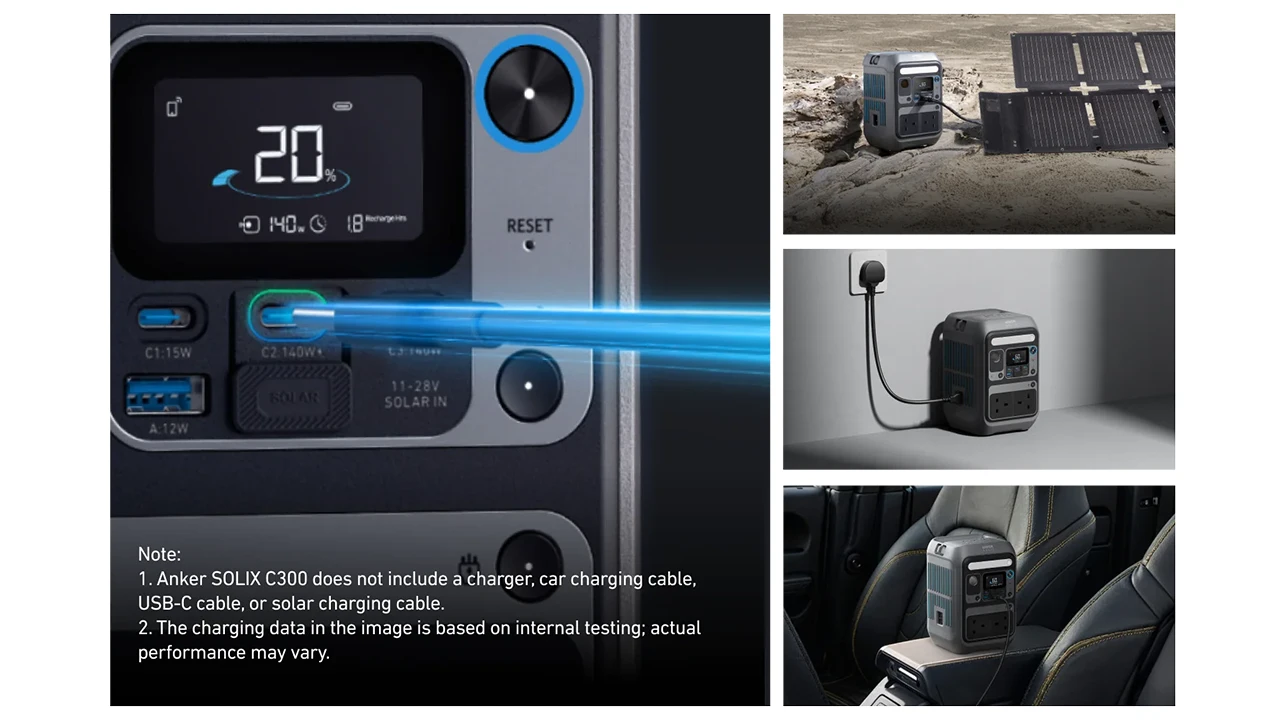 این پاور استیشن علاوه بر برق شهری، از شارژ خورشیدی (Solar Charging) نیز پشتیبانی می کند. پاور استیشن انکر مدل SOLIX C300 برای شارژ به پنل های خورشیدی ۶۰ وات یا ۱۰۰ وات نیاز دارد. این ویژگی در سفر یا مناطق بدون برق کاربرد دارد. با توجه به اینکه دستگاه، ورودی DC با ولتاژ 11 تا 28 ولت دارد، علاوه بر پنل های خورشیدی، امکان اتصال مستقیم به فندکی خودرو را نیز فراهم می کند. جدول زیر مشخصات محصول را نشان می دهد.