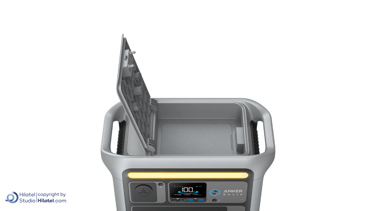 یکی از جزئیات پاور استیشن انکر مدل SOLIX C800 وجود محفظه نگهداری داخلی است که فضای مخصوصی برای قرار دادن کابل ها، آداپتورها و لوازم جانبی فراهم می کند. این بخش به شما کمک می کند تمام تجهیزات موردنیاز خود را همیشه همراه داشته باشید، بدون آنکه نگران گم شدن یا درهم ریختگی وسایل باشید.