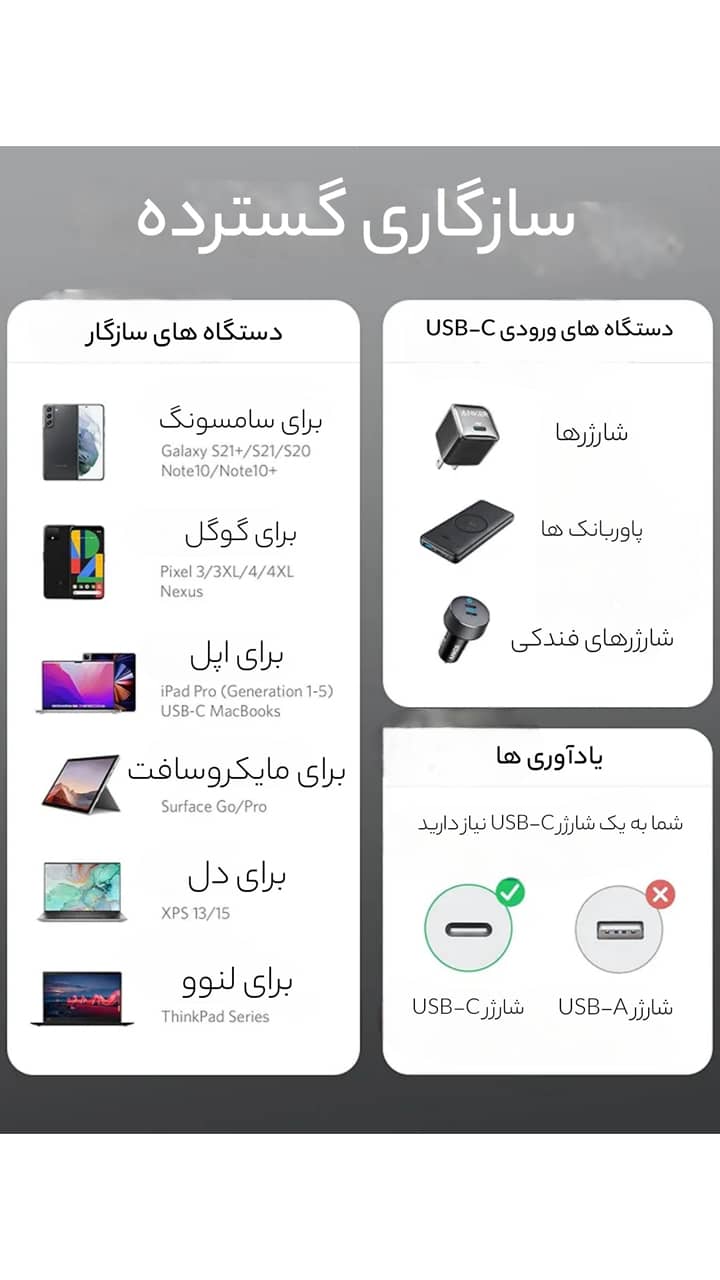کابل شارژ 60 وات USB-C به USB-C انکر مدل A81F6 یکی از کابل شارژ های محبوب برای دستگاه هایی است که از پورت USB-C پشتیبانی می کنند، دو سر این کابل به پورت USB-C مجهز است که امکان اتصال دستگاه ها با پورت USB-C را فراهم می کند. این پورت ها قابلیت انتقال داده و شارژ را دارا هستند.