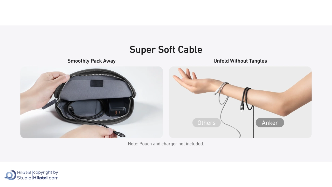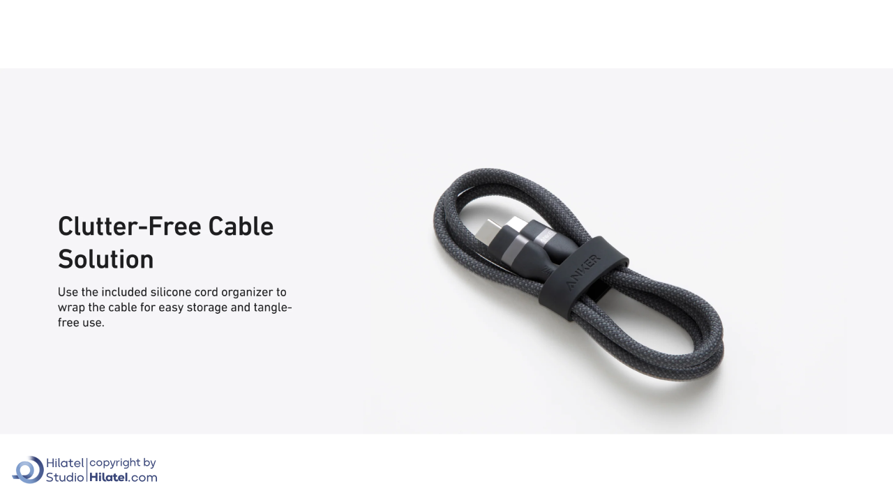 اقلام درون جعبهکابل USB-C به USB-C انکر (طول ۹۰ سانتیمتر، توان ۲۴۰ وات، بافتهشده از مواد بازیافتی)، نگهدارنده سیلیکونی کابل، دفترچه راهنما