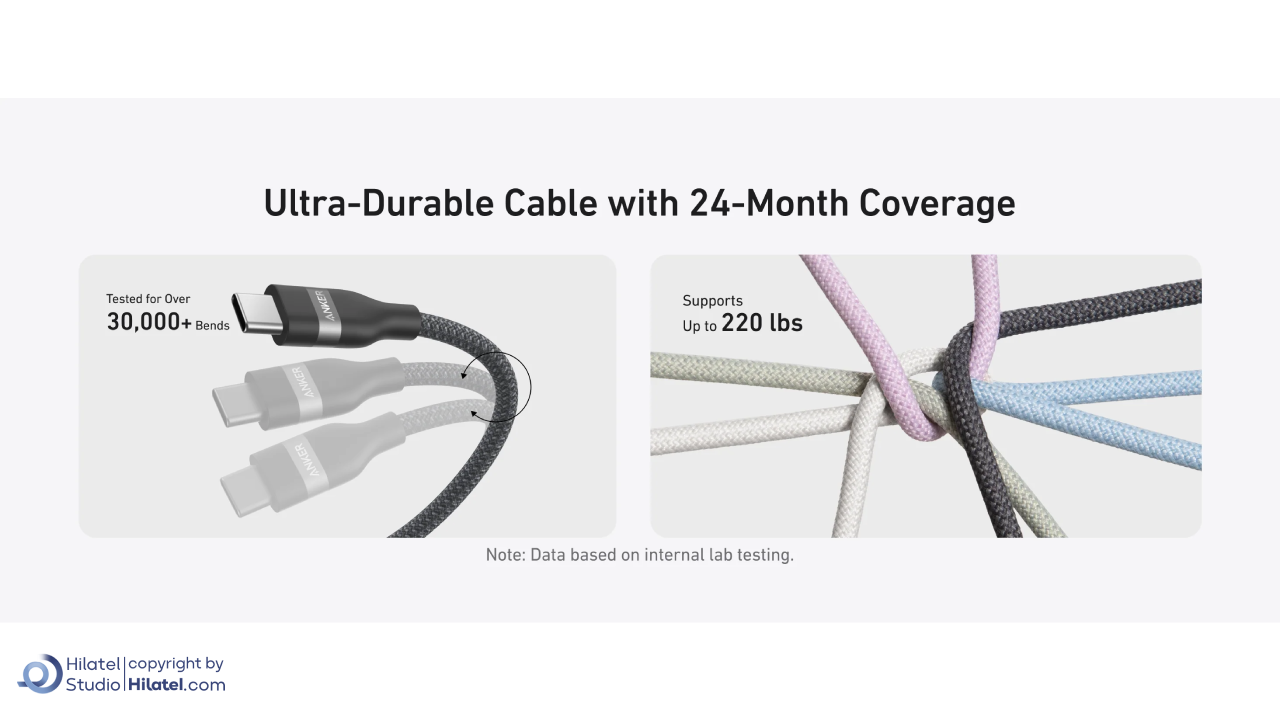 کابل شارژ 240 وات 0.9 متری USB-C به USB-C انکر مدل A82E2H11 از جنس مواد بازیافتی با کیفیت بسیار بالا ساخته شده که مقاومت زیادی در برابر خم شدن، پارگی و کشش دارد. همچنین، چیپست هوشمند داخلی بهکار رفته در آن، جریان برق را بر اساس نیاز دستگاه بهینه سازی می کند.
