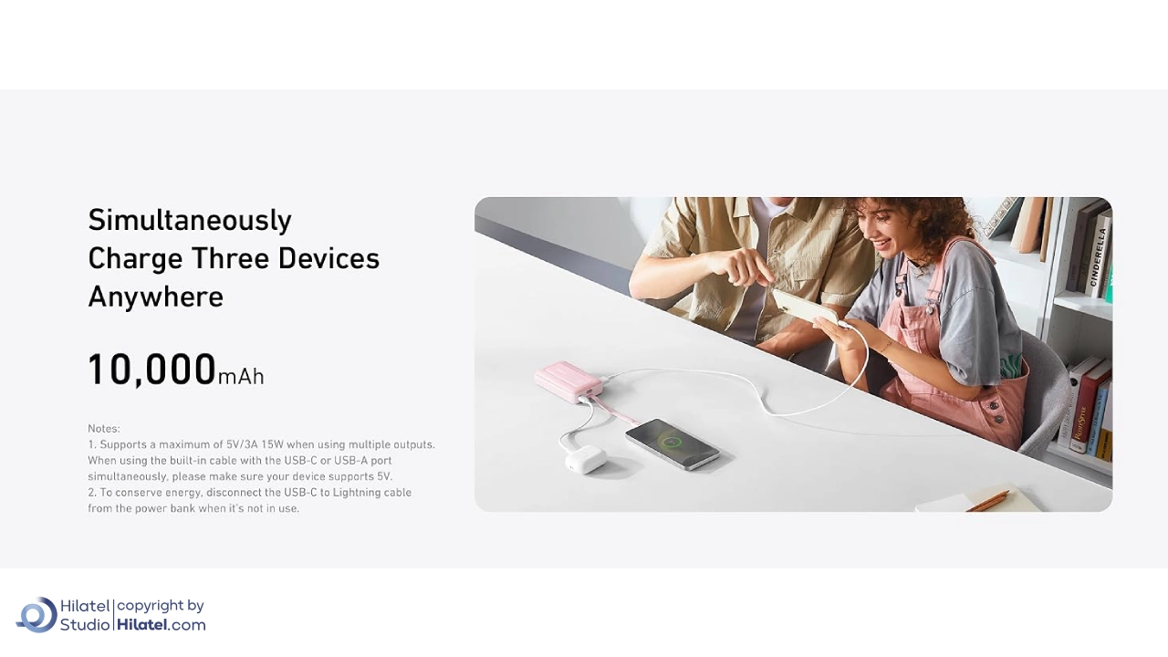 شارژ چند دستگاه به طور همزمان: می توان به طور همزمان چند دستگاه را با پاوربانک 30 وات 10000 میلی آمپر انکر مدل A1688 شارژ کرد. در حالتی که چند پورت استفاده می شوند، شدت جریان خروجی 5V/3A با توان خروجی 15 وات است. حتماً مطمئن شوید که دستگاه شما از ولتاژ 5 ولت پشتیبانی می کند. برای ذخیره انرژی، کابل USB-C به لایتنینگی را که به پاوربانک متصل است از آن جدا کنید.
