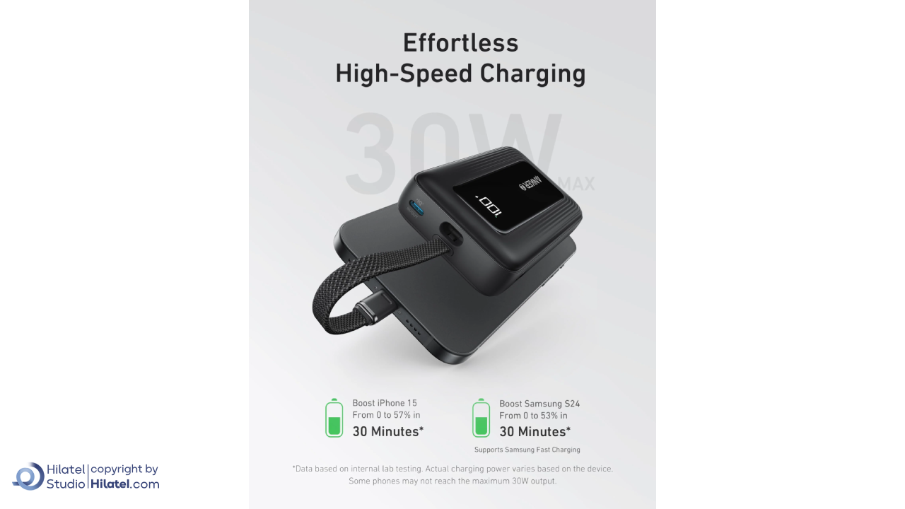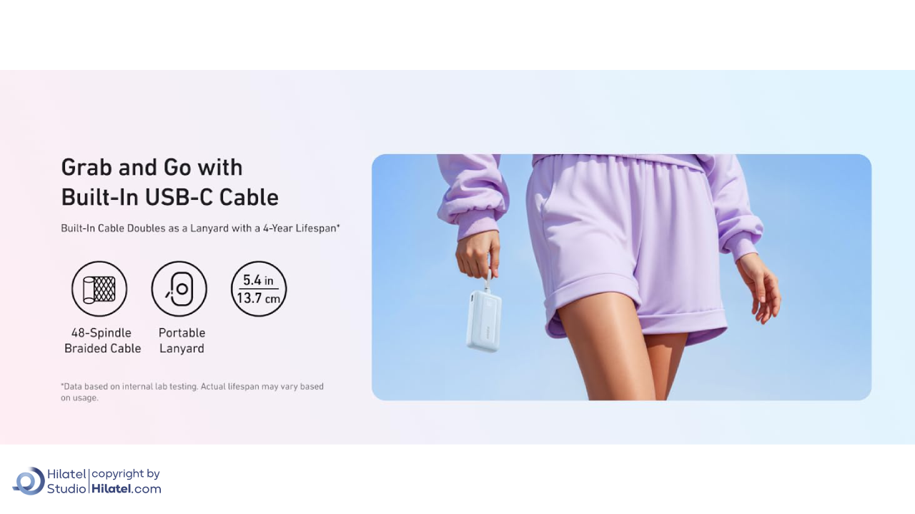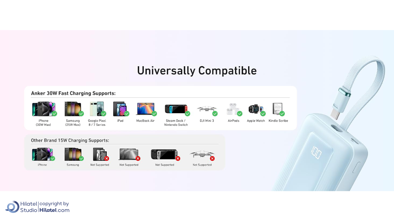 شارژ سریع 30 وات: iPhone (حداکثر 30 وات) Samsung (حداکثر 25 وات) Google Pixel 7 / 8 series iPad MacBook Air Steam Deck / Nintendo Switch DJI Mini 3 انواع AirPod Apple Watch Kindle Scribe شارژ 25 وات: iPhone Samsung |