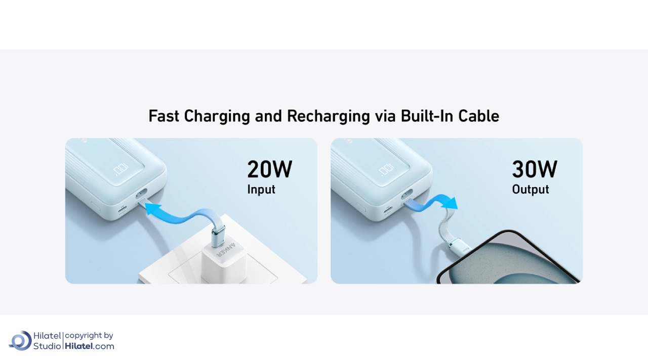 شارژ دوسویه: برای شارژ پاوربانک Anker A1688 ورودی تا حداکثر 20 وات و شارژ دستگاه از طریق پاوربانک حداکثر خروجی 30 وات دارد. قابل توجه است که در هر دو حالت، این پاوربانک از تکنولوژی فست شارژ پشتیبانی می کند.