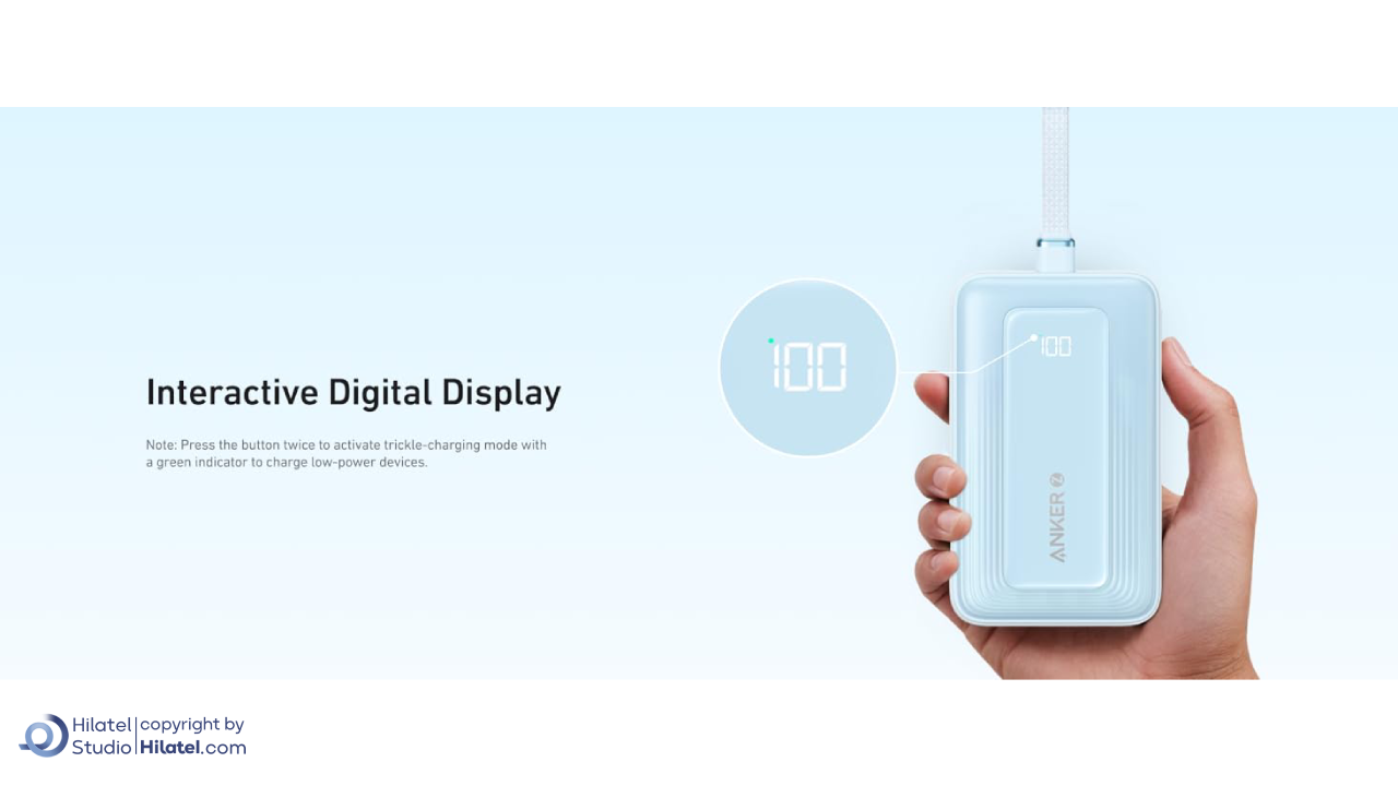 شارژ قطره ای و صفحه نمایشگر: بر روی پاوربانک 30 وات انکر مدل A1688 صفحه نمایشگری تعبیه شده که وضعیت شارژ پاوربانک را نشان می دهد. همچنین اگر دکمه پاوربانک را دو بار فشار دهید، حالت شارژ قطره ای فعال شده و علامت آن به صورت نقطه ای سبز نمایان می شود.