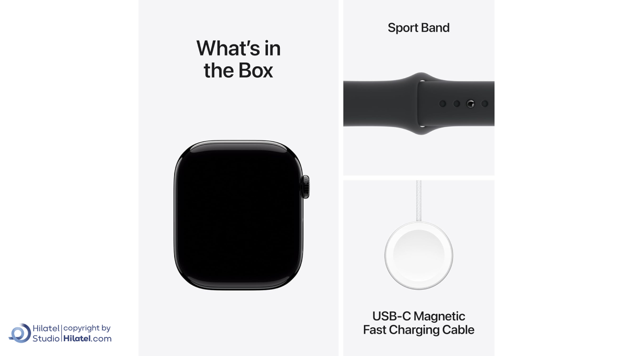 اقلام درون جعبهاپل واچ سری 10 - بند - شارژر سریع مغناطیسی ۱ متری اپل واچ به کابل USB-C