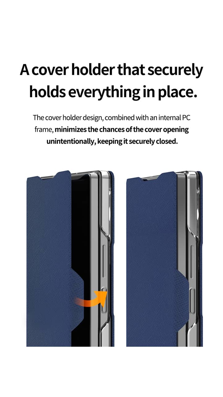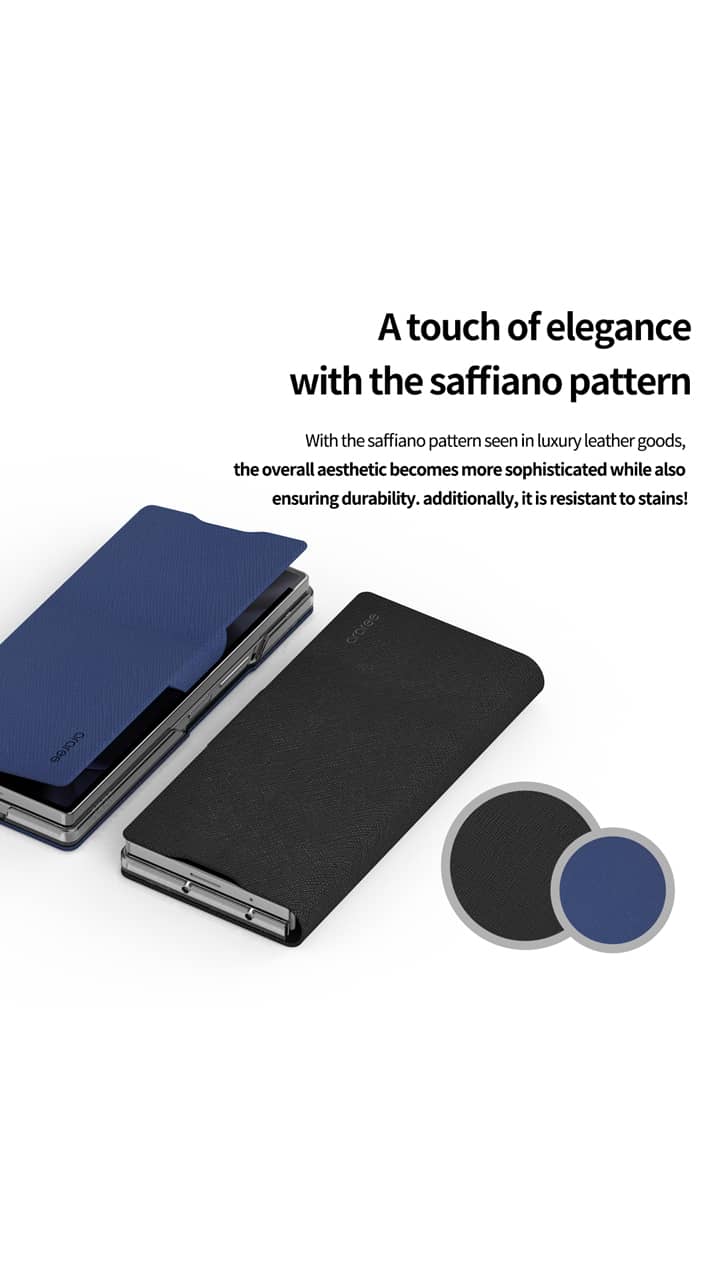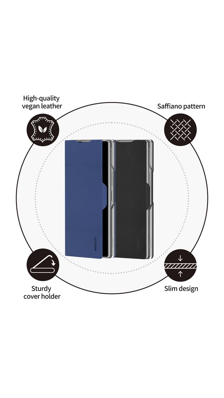 قاب گوشی و کاور کلاسوری araree مدل Bonnet Diary مناسب برای سامسونگ Galaxy Z Fold 6 در دو رنگ آبی و مشکی تولید می شود که بهترین رنگ ها برای چرم های مصنوعی طبیعی هستند. کاور Araree Bonnet Diary Galaxy Z Fold 6 به دلیل طراحی کلاسوری، روی نمایشگر قرار می گیرد و زمانی که گوشی درون کیف یا جیب قرار دارد، از صفحه نمایش محافظت می کند. ویژگی کلاسوری این کاور قابلیت استند شدن را فراهم می کند.