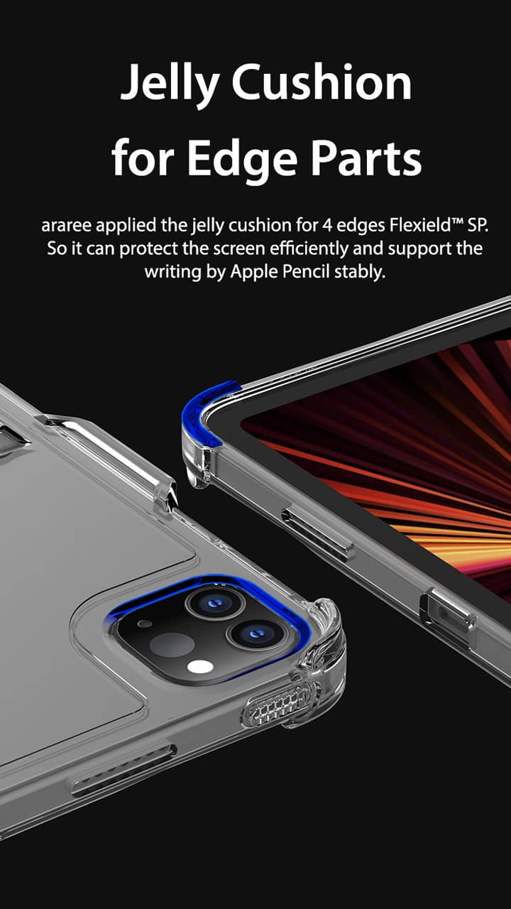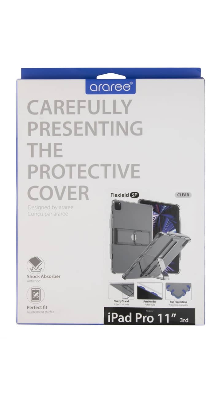 آیپدهای شرکت اپل در برابر ضربه آسیب پذیر هستند؛ به همین دلیل انواع کاورهای محافظ بدنه برای آن ها تولید و به بازار عرضه می شود. قاب تبلت آراری مدل Flexield SP مناسب "iPad Pro 11 از جنس TPU (پلی اورتان) تولید می شود و در دو رنگ به فروش می رسد. قاب شفاف Clear که بدون رنگ است و کاور شفاف Clear Black که رنگی تیره و متمایل به مشکی دارد.