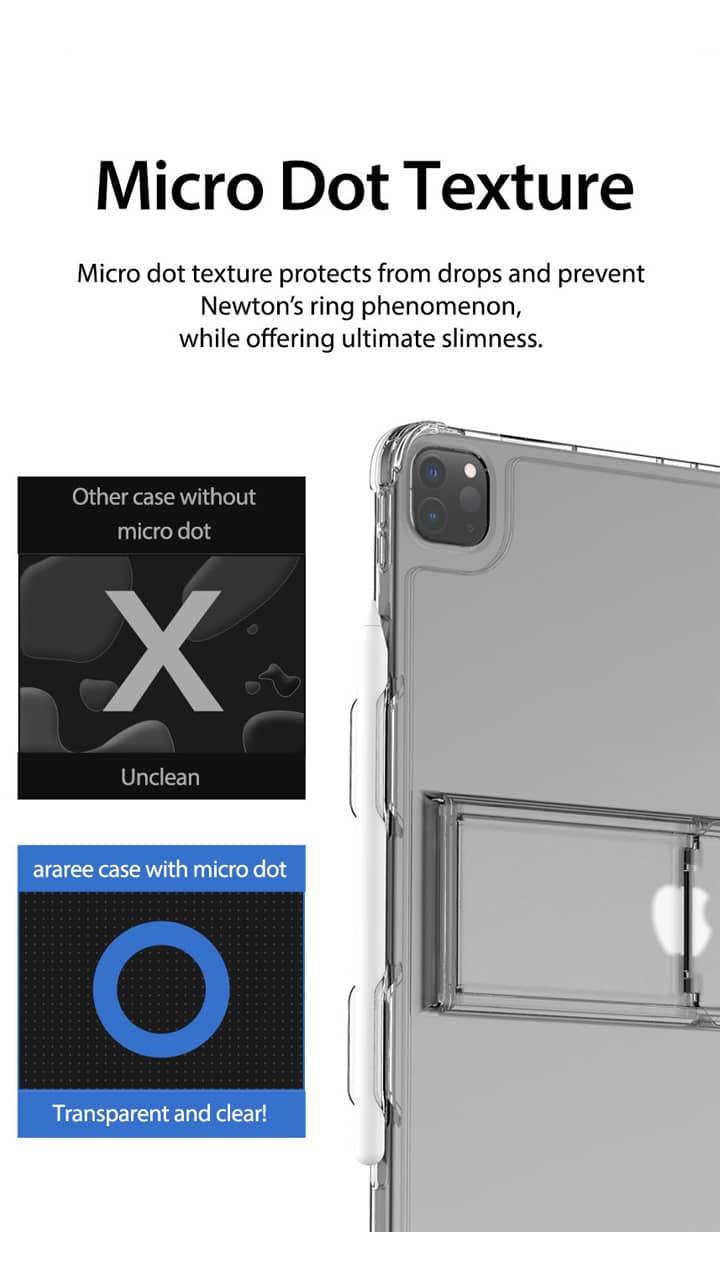کاور تبلت اپل iPad Pro 11 با 255 گرم وزن، محصولی سبک و خوش دست به شمار می رود. کناره قاب Araree Flexield SP iPad Pro 11" 3rd محفظه ای برای نگهداری قلم هوشمند طراحی شده است. این محصول مقاومت بالایی در برابر شوک و افزایش دما مقاوم دارد و از آسیب به بدنه آیپد جلوگیری می کند.