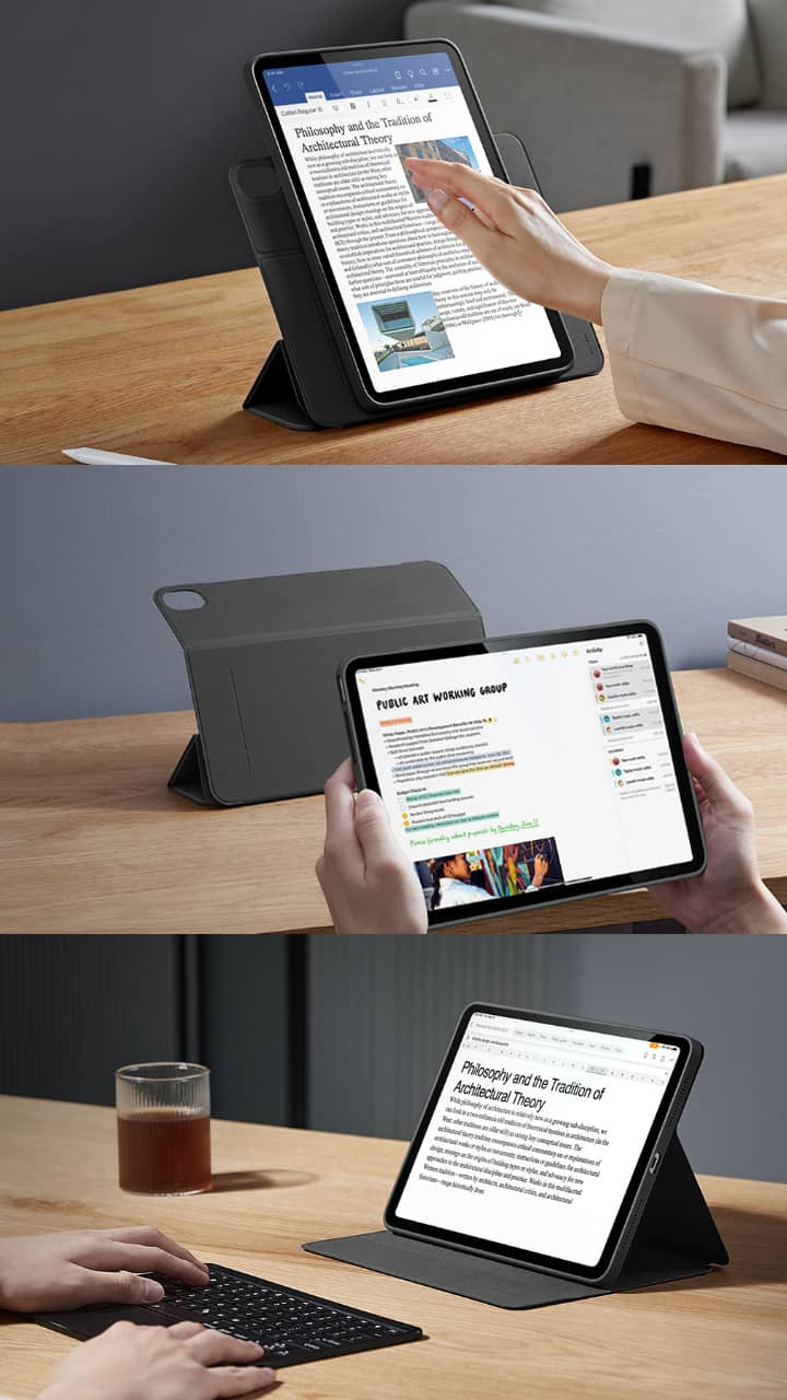 قاب مغناطیسی Araree Hifolio با یک طراحی ماهرانه برای محافظت و استفاده آسان از تبلت های iPad Air 13 و iPad Pro 12.9 ارائه گردیده است. در تولید این کیف تبلت از بهترین متریال استفاده شده و عملکرد فوق العاده ای در جذب ضربات دارد. علاوه بر این، لایه داخلی قاب نیز بسیار نرم است و مانع از ایجاد هر گونه خراش روی دستگاه می شود. کیف Araree Hifolio iPad Air 13-inch را می توانید به عنوان پایه نگهدارنده نیز استفاده کنید و کارهای روزانه خود را راحت تر انجام دهید.