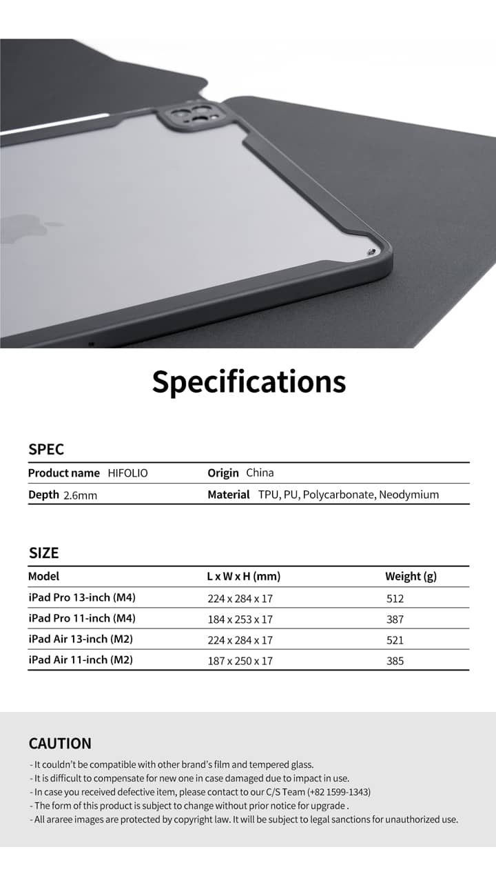 سایر مشخصات فنی کیف Araree Hifolio iPad Air 13-inch