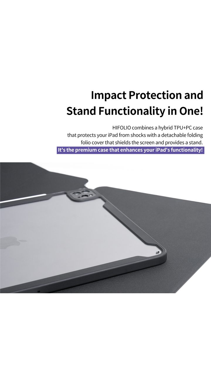 شما می توانید iPad خود را برای تماشای فیلم یا شرکت در کنفرانس های ویدئویی به سادگی در حالت ایستاده نگه دارید، که برای این کار کافی است پایه باریک در قسمت بالای کیف Hifolio را باز کنید. این پایه امکان چرخش تبلت در دو حالت 15 و 65 درجه را دارد تا شما به دلخواه خود آن را تنظیم کنید. همراه کیف یک کاور مداد وجود دارد که از قلم آیپد شما به خوبی محافظت می کند، به طور کلی مهم ترین مشخصات این محصول عبارتند از: