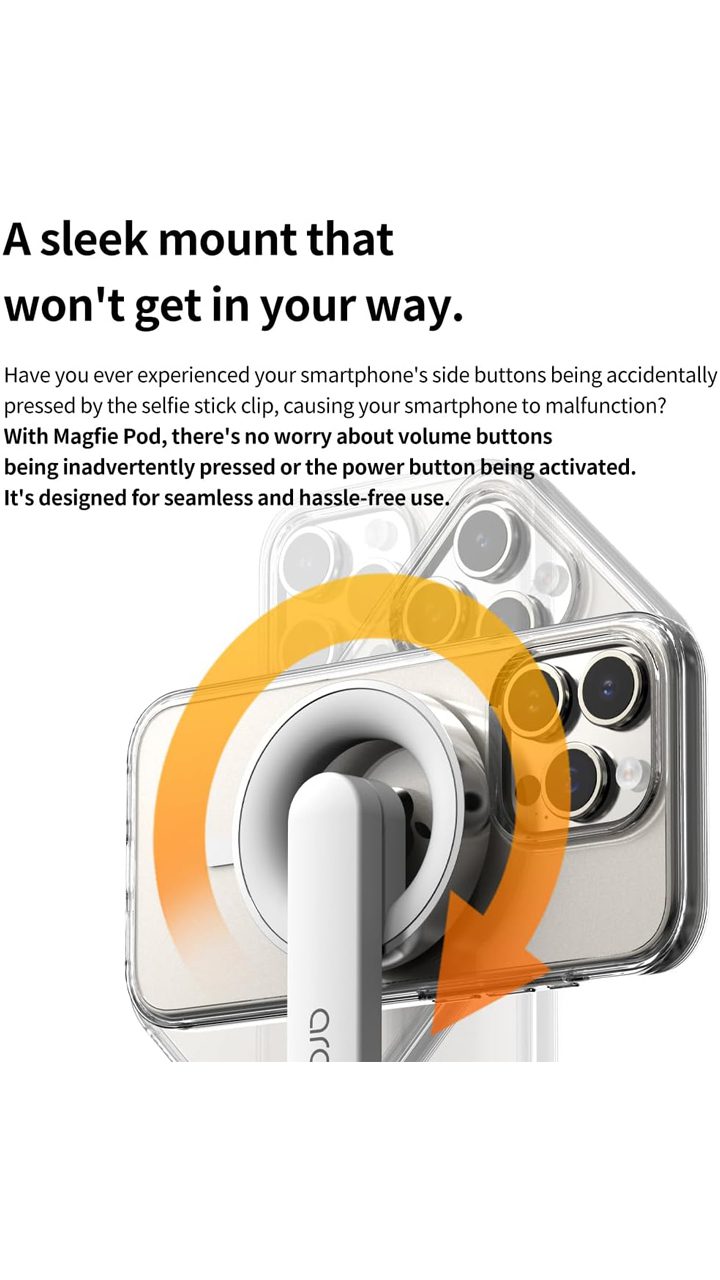 Magfie Pod به فناوری مگ سیف مجهز است که امکان اتصال سریع و ایمن گوشی های سازگار، مانند آیفون سری 12 به بعد، را فراهم می کند. این ویژگی با ایجاد اتصال مغناطیسی قوی، لرزش یا افتادن گوشی را به حداقل رسانده و کار با دستگاه را راحت تر می کند.