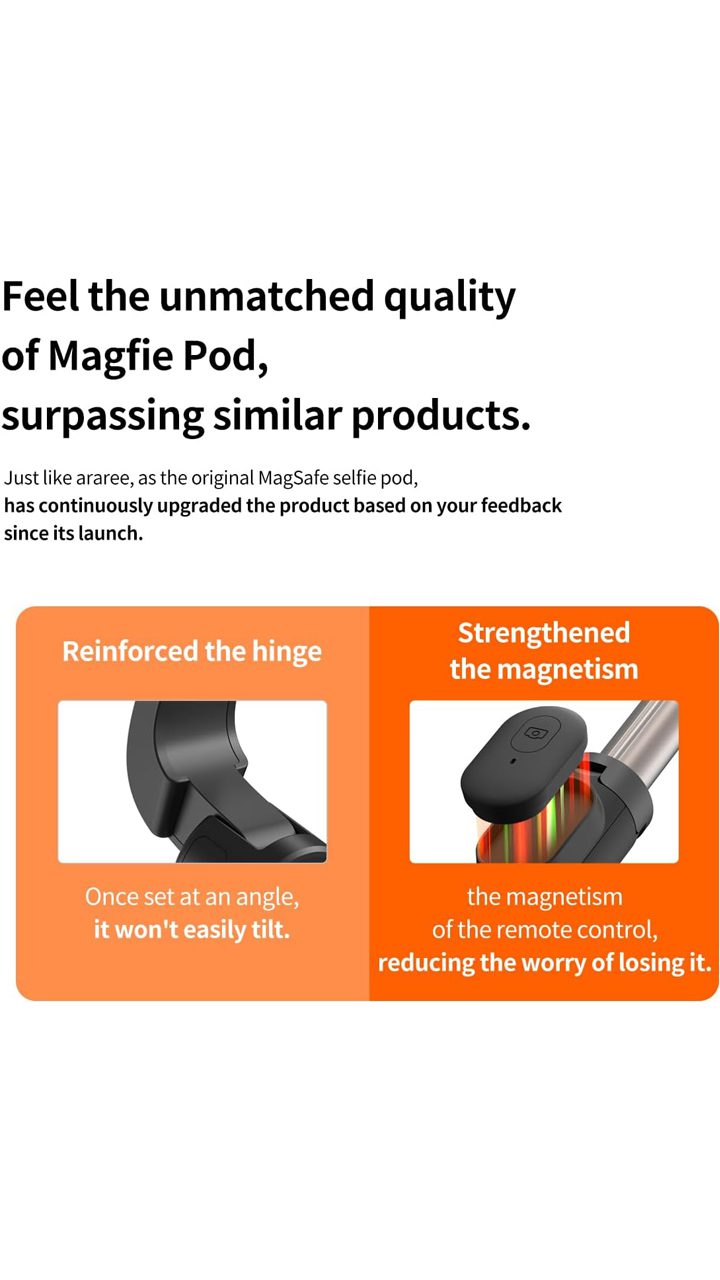 Magfie Pod از آلیاژ آلومینیوم با کیفیت بالا ساخته شده که ضمن سبکی، دوام و استحکام زیادی را ارائه می دهد. پایه های ضد لغزش آن با کف پوش های سیلیکونی، ثبات فوق العاده ای روی سطوح مختلف ایجاد می کنند. طراحی تاشو و وزن سبک این محصول، جابه جایی و استفاده از آن را در سفر یا محیط های کاری آسان می کند.