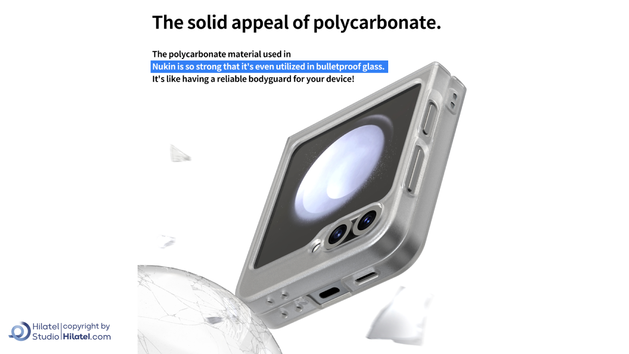 لبه ها و پشت قاب گوشی آراری مدل Nukin مناسب Galaxy Z flip 7 FE | Flip 6 از جنس پلاستیک سخت (پلی کربنات) ساخته شده است. این ماده در برابر ضربه و خط و خش مقاوم است و مانع از آسیب دیدن بدنه گوشی می شود.