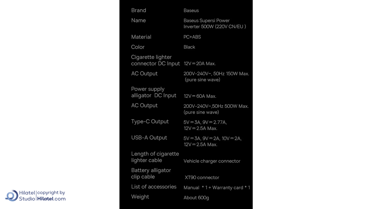 اینورتر خودرو باسئوس مدل BS-CI50-02 یک مبدل برق DC به AC است که ولتاژ 12 ولت مستقیم (DC) خودرو را به 220 ولت متناوب (AC) با فرکانس استاندارد 50-60 هرتز تبدیل میکند. ؛ سایر مشخصات فنی آن را در جدول زیر مشاهده میکنید: