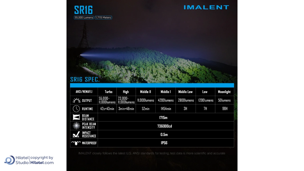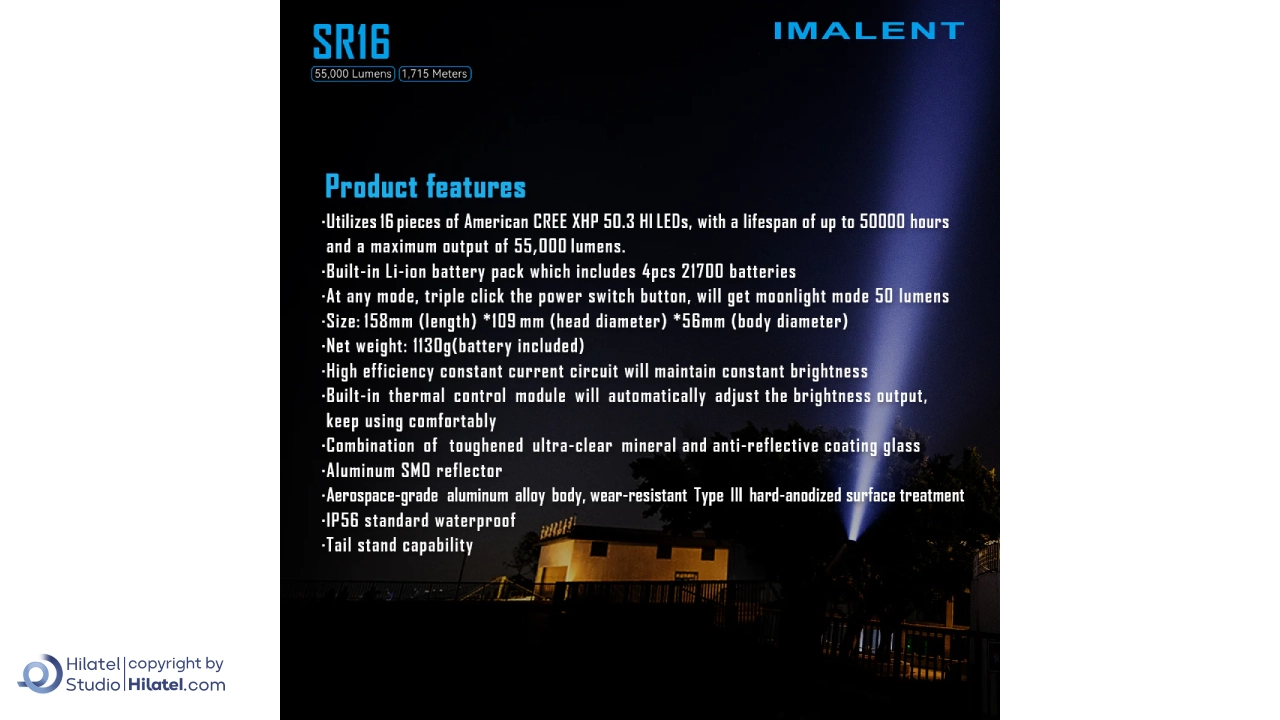 چراغ قوه شارژی ایملت مدل SR16 با وجود اندازه کوچکش، کارایی زیادی از خود نشان می دهد. نوری به قدرت 55000 لومن که تا 1715 متر پیش می رود. ایملت، در زمینه تولید انواع چراغ قوه موفق بوده و اکنون نیز با مدل SR16 کیفیت بالای محصول را به کاربران خود ثابت کرده است.