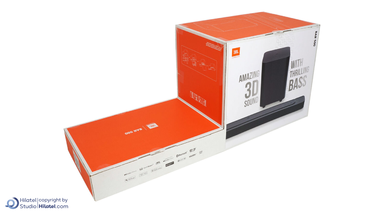ساندبار JBL Bar 500 یک سیستم صوتی خانگی با صدای فراگیر 5.1 کاناله است که همراه با یک ساب ووفر بی سیم 10 اینچی عرضه می شود و برای پوشش صدای بم با عمق بالا و دقیق طراحی شده است. پشتیبانی از فناوری Dolby Atmos باعث می شود صدا به صورت عمودی و افقی در فضا پخش شود و تجربه شنیداری واقعگرایانه تری ارائه دهد.