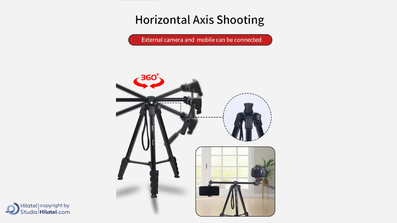 این سه پایه بازوی افقی دارد؛ به این معنا که محور مرکزی سه پایه می تواند از حالت عمودی خارج شود و به صورت افقی قرار گیرد. در این حالت، دوربین به بیرون از مرکز سه پایه منتقل می شود و برای عکس برداری یا فیلم برداری از زاویه عمودی از بالا (Flat Lay Shot) کاربرد دارد. جدول زیر مشخصات این محصول را نشان می دهد.