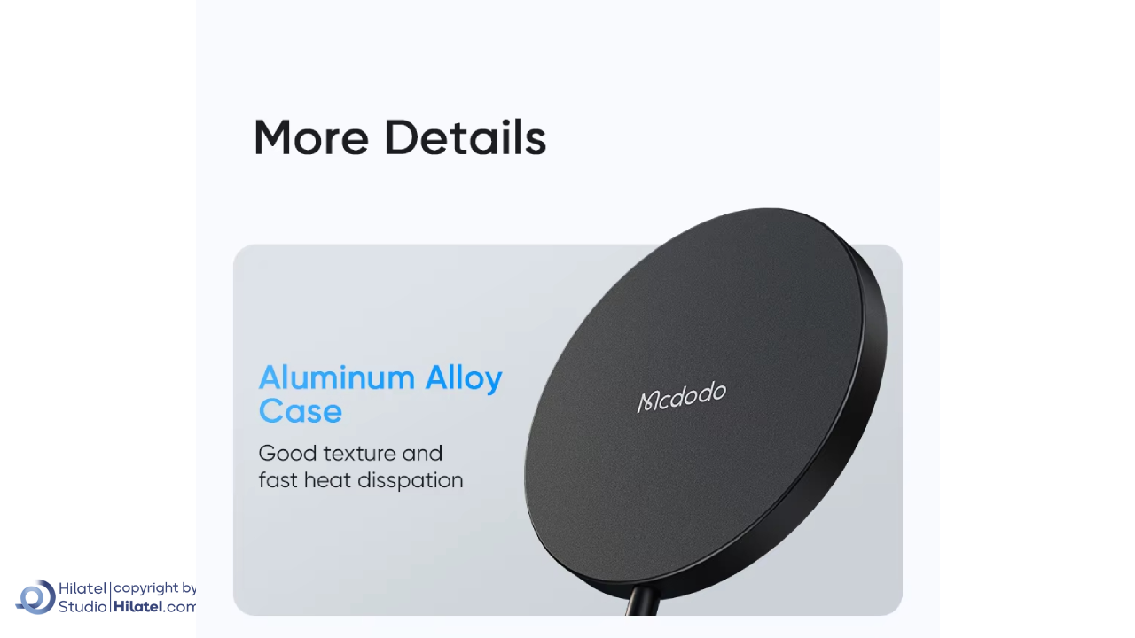 - شارژر وایرلس 15 وات مگ سیف مک دودو مدل CH-436 دارای 6 لایه محافظتی شامل فناوری FOD، کنترل دمای هوشمند، محافظت در برابر اضافه بار، و قطع خودکار پس از شارژ کامل است.