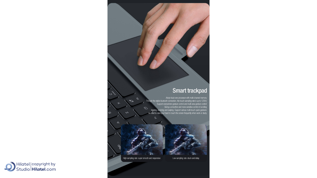 با استفاده از بلوتوث می توانید کیبورد را به دستگاه موردنظرتان وصل کنید. این مدل کیف کیبورد دار دارای پد لمسی دقیق با پشتیبانی از ژست های چند لمسی (Multi-touch)بوده و از حساسیت زیادی برخوردار است. برای کار با کیبورد لازم نیست که حتماً دکمه ها را محکم فشار دهید؛ لمس جزئی صفحه کلید کافی است. به جای موس می توانید از پد لمسی استفاده کنید که روی این کیف کیبورد دار به کار برده شده است.