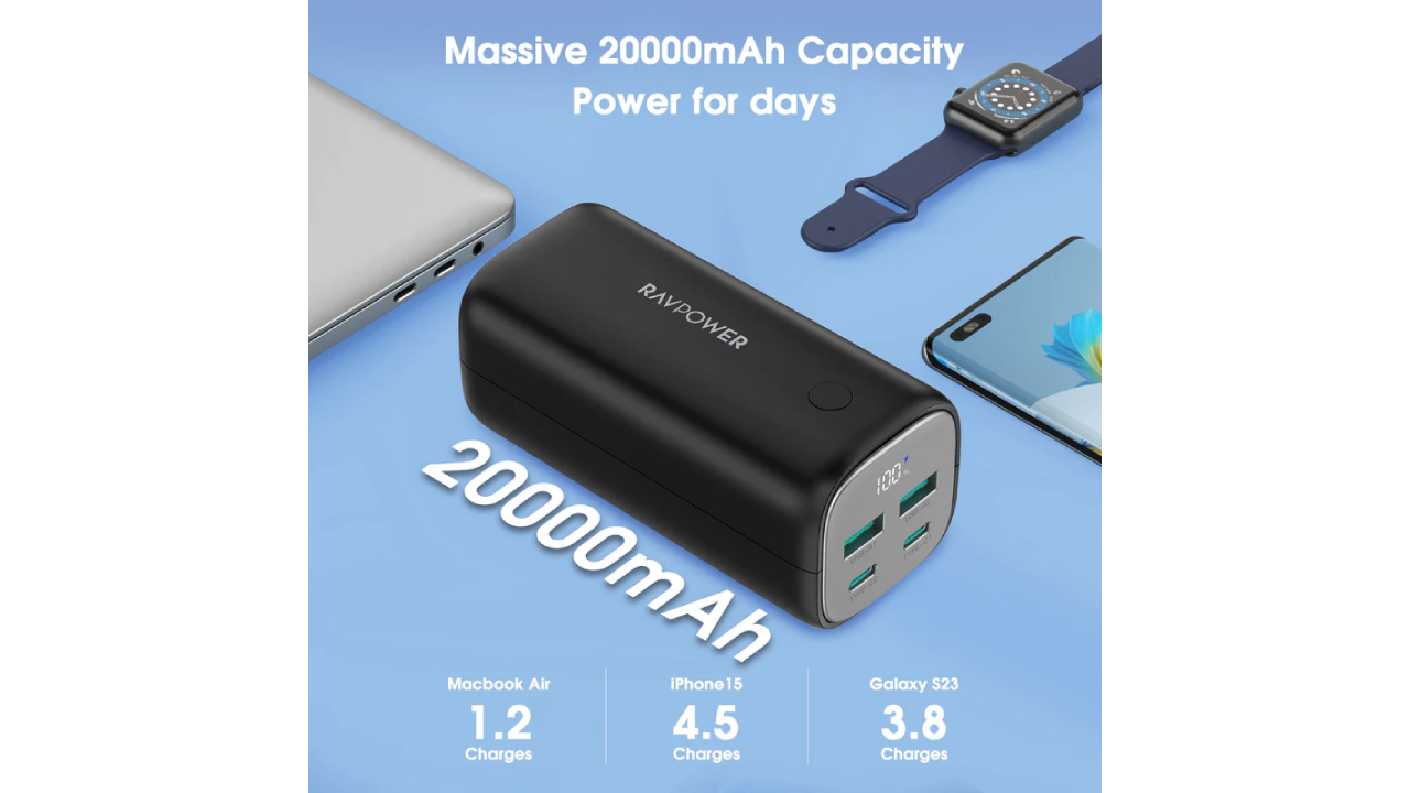 با ظرفیت ۲۰,۰۰۰ میلی آمپر ساعت، این پاوربانک می تواند دستگاه های مختلفی مانند آیفون ۱۵، سامسونگ گلکسی S۲۳ و مک بوک ایر را چندین بار شارژ کند. به طور خاص، می توان تا4.5 بار آیفون15، 3.8 بار سامسونگ گلکسی S23 و 1.2 بار مک بوک ایر را شارژ کرد. طراحی جمع و جور و وزن سبک این مدل، باعث می شود که حمل آن بسیار آسان باشد. علاوه بر این، باتری لیتیوم یونی این پاوربانک با دوام مناسب و قابلیت شارژ همزمان 4 دستگاه، عملکردی کارآمد ارائه می دهد.