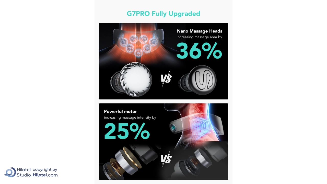 ماساژور G7 Pro-Max مجهز به 9 سر ماساژ نانو است. این ویژگی با افزایش 25 درصدی قدرت نسبت به مدل های قبلی، تجربه ای عمیق تر و موثرتر از ماساژ را فراهم می کند. این سرها با پوشش سطح وسیع تری از گردن، به تسکین درد و کاهش تنش های عضلانی کمک می کنند.