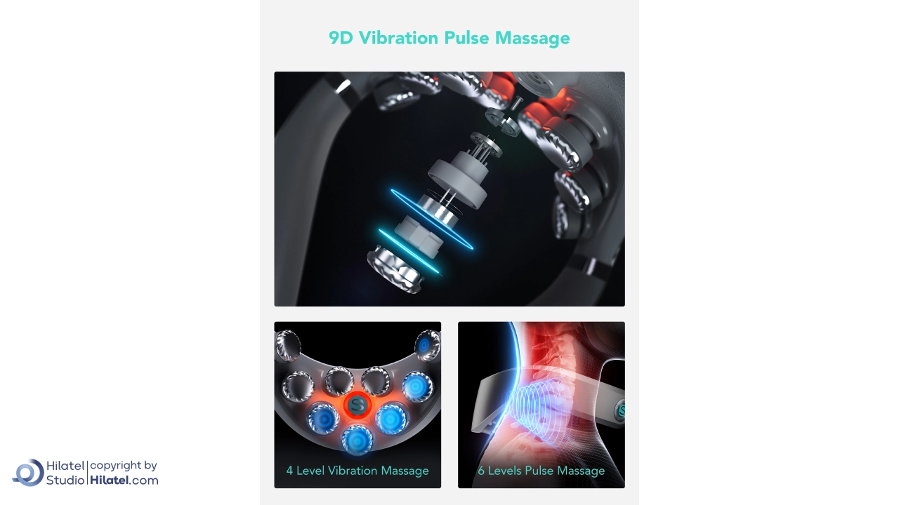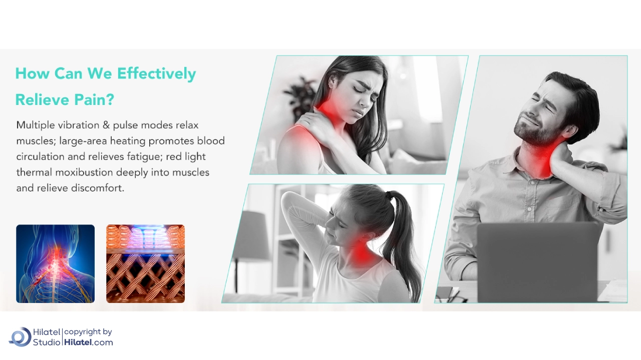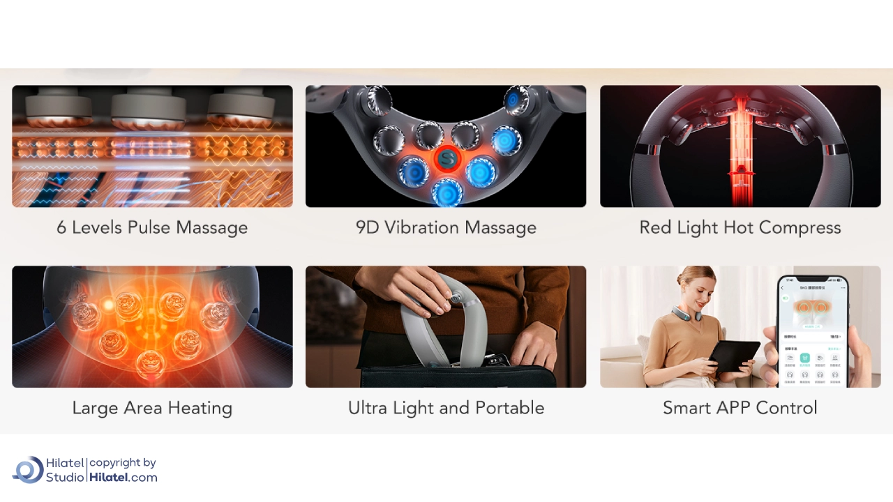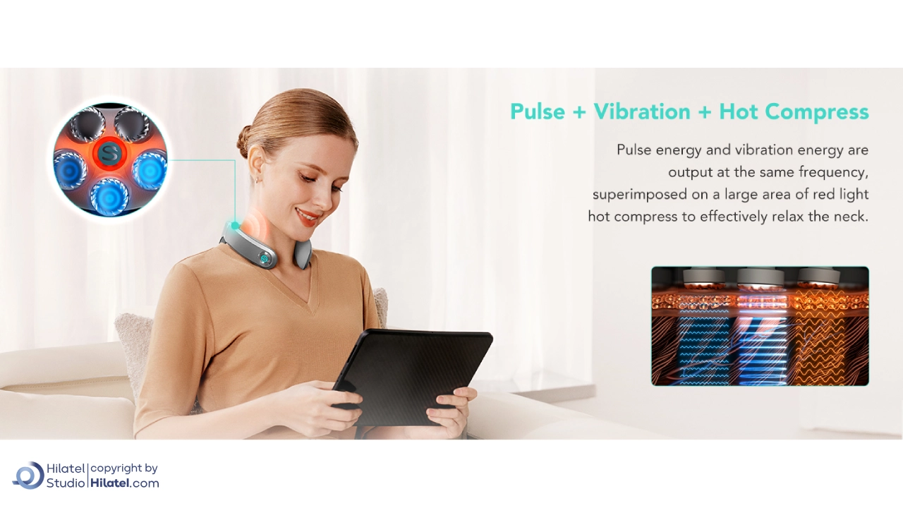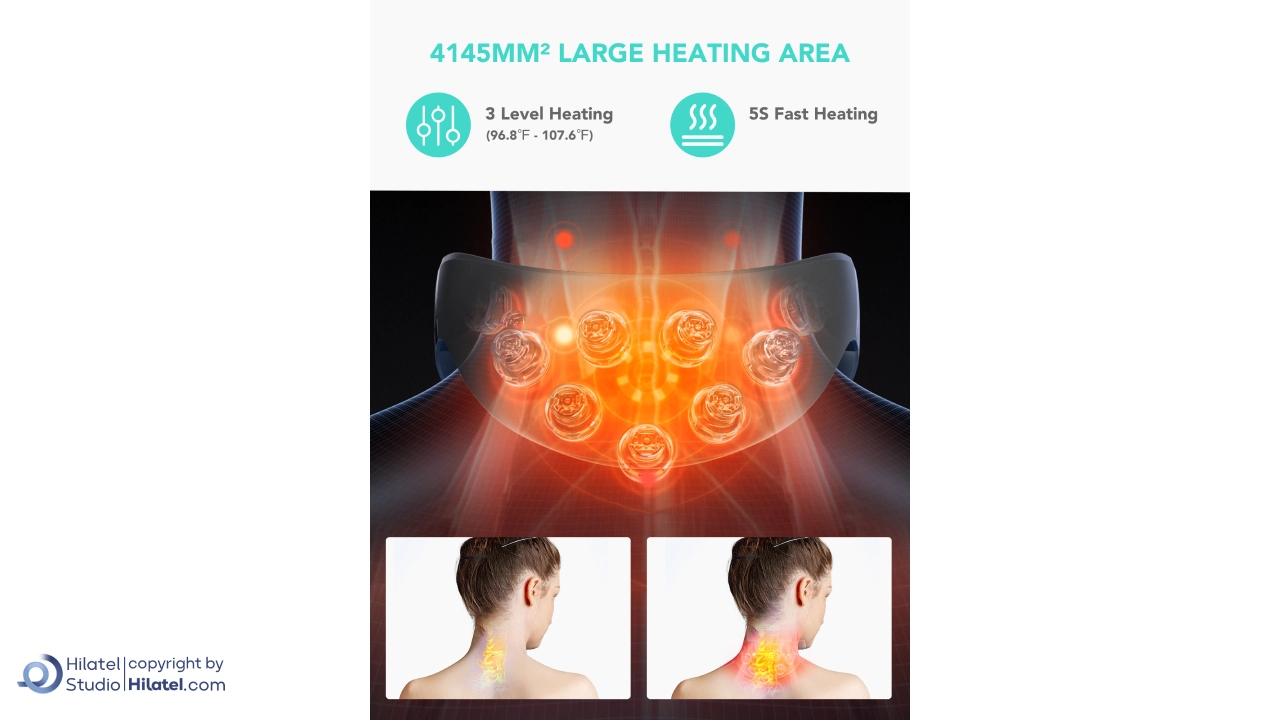 این دستگاه با قابلیت گرمایش و قرارگیری در حالت 120 درجه ای و 9 سر گرمایشی نانو، امکان ایجاد کمپرس گرم در اطراف گردن را فراهم می کند. با سه سطح دمای قابل تنظیم (98.6°F تا 109.4°F)، کاربران می توانند دمای مناسب با نیاز خود را انتخاب کنند.